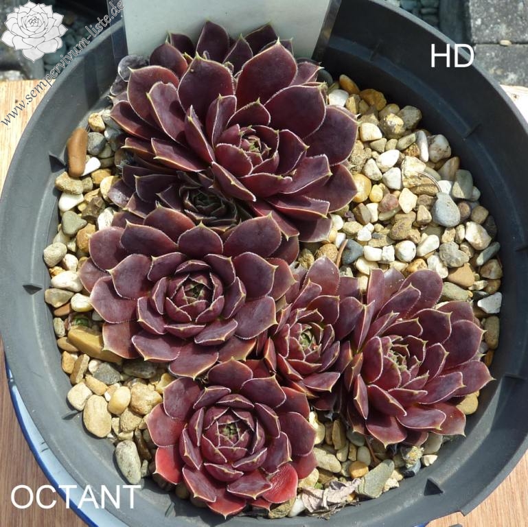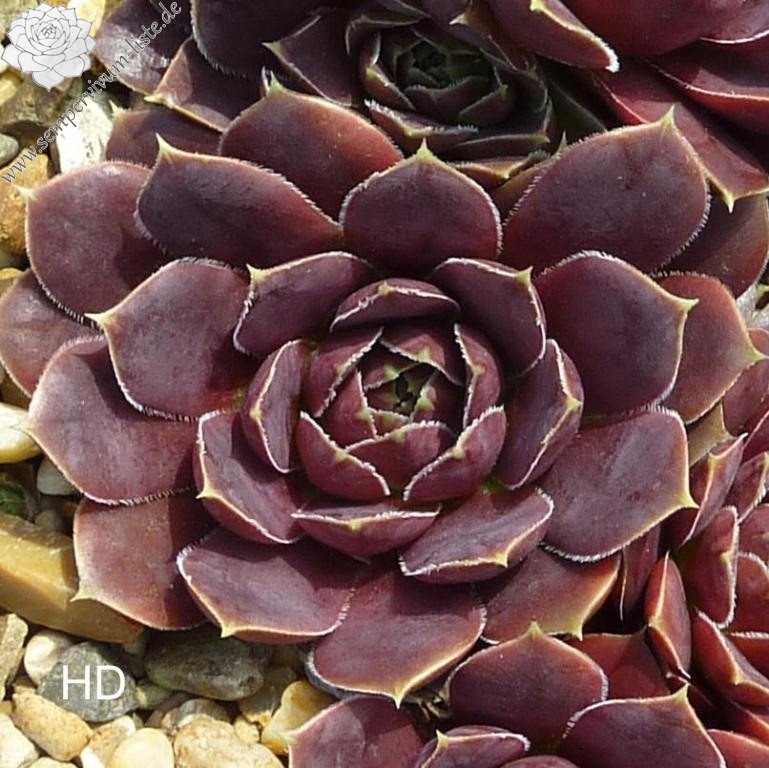 Rosetten bis 8 cm, Blätter keilförmig, kurz bespitzt, dunkles Weinrot, Ränder hell, leicht bewimpert