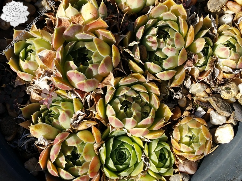 Rosetten 5 cm, Blätter spatelig, lang bespitzt, Mischfarben grün - gelb - rosa, Blattränder gelb