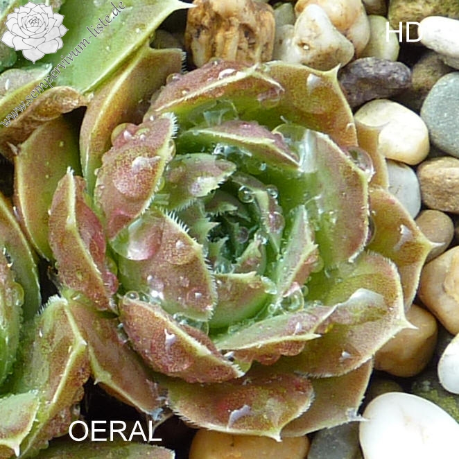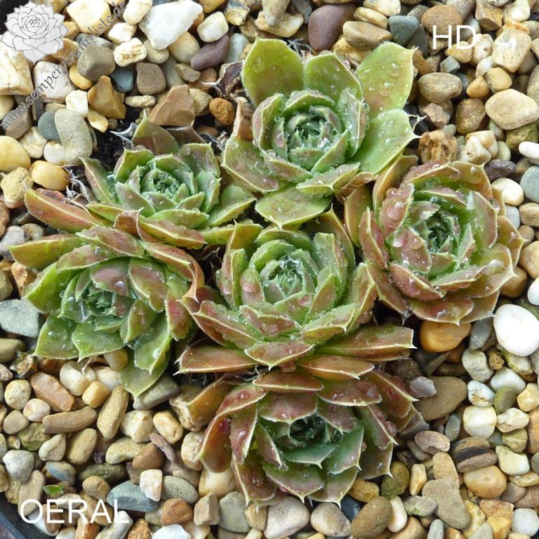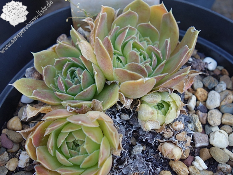 Rosetten bis 4 cm, Blätter rundlich, kurz bespitzt, resedagrün, Blattspitzen pastellrosa, Blattränder bewimpert