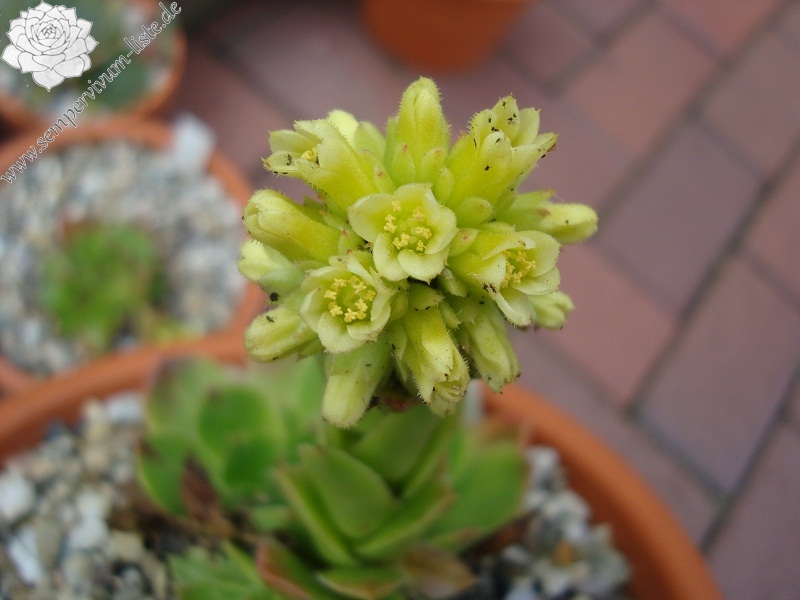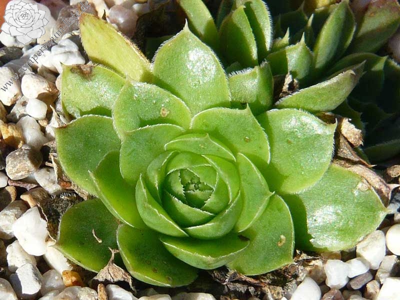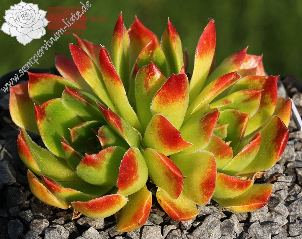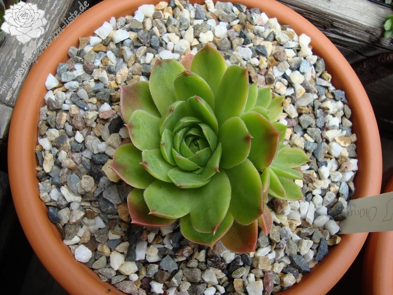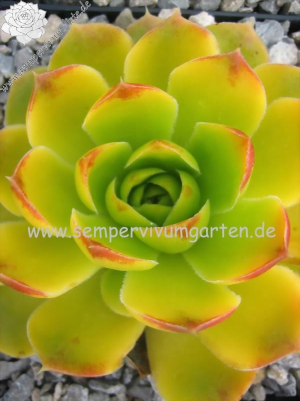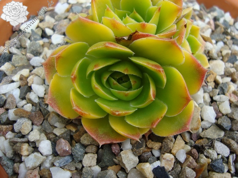 Die mittelgroßen Rosetten der reizenden Sorte sind während der Frühlingsmonate in gelbgrüner Färbung die später zu Jadegrün wechselt. Die Blätter sind auffallend breit mit orange-rosafarbenen Spitzen. Noch kaum in Kultur und daher bislang fast unbekannt.