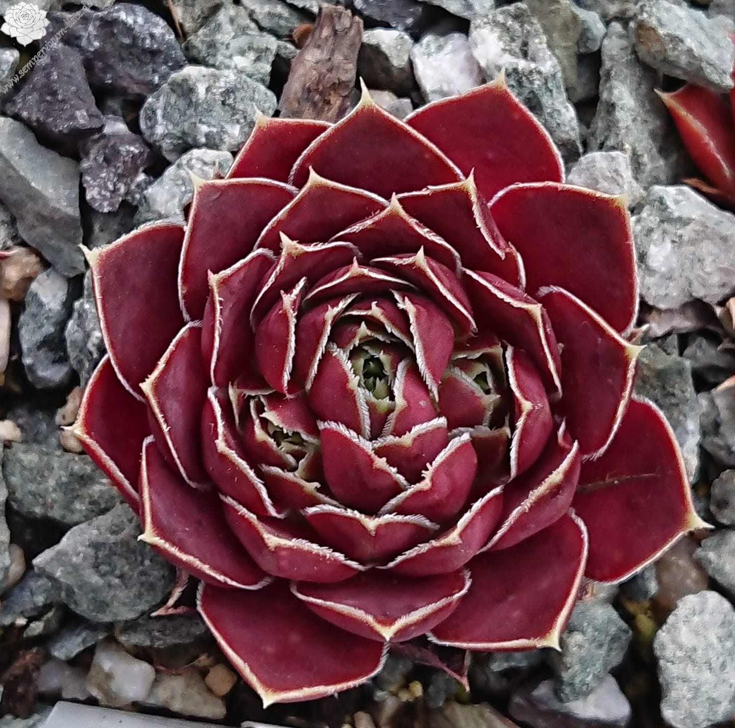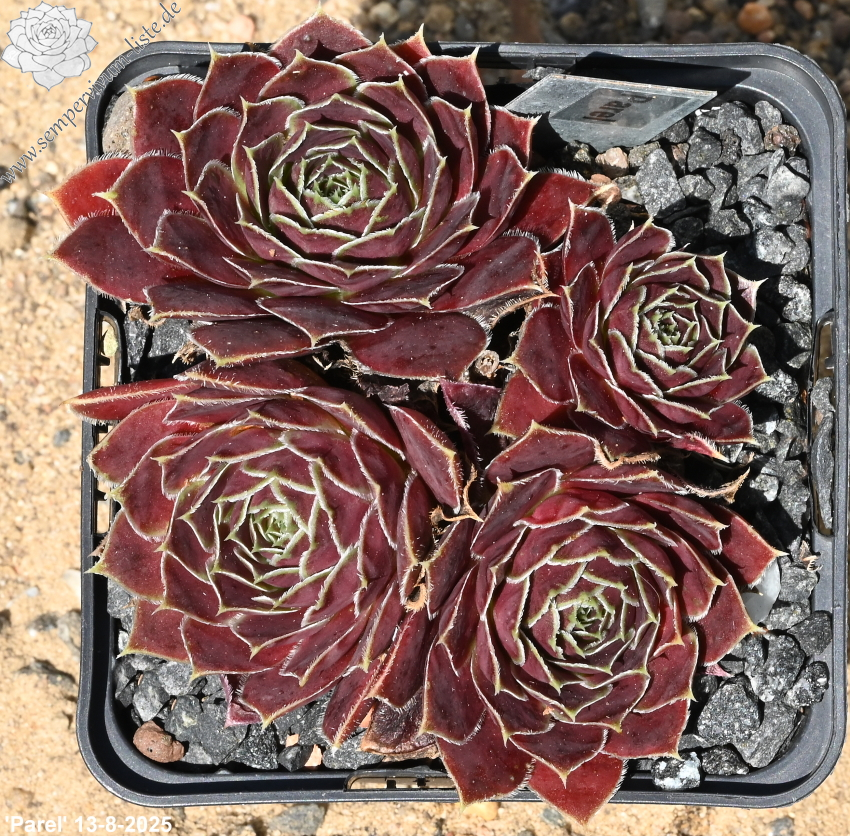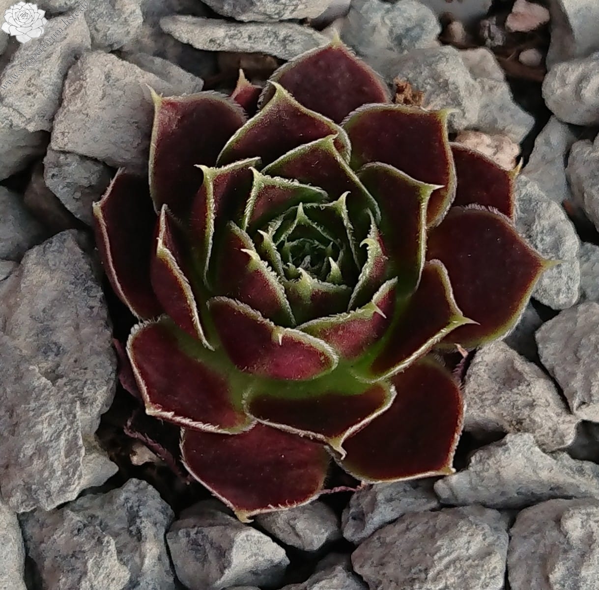 Rosetten bis 4 cm, Blätter breit keilförmig, lang bespitzt, braunrot, Blattränder hell