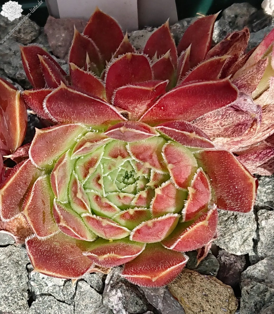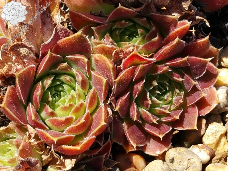 kleine Rosetten hellgrün, Spitzen bräunlich rot panaschiert, Blattränder hell bewimpert