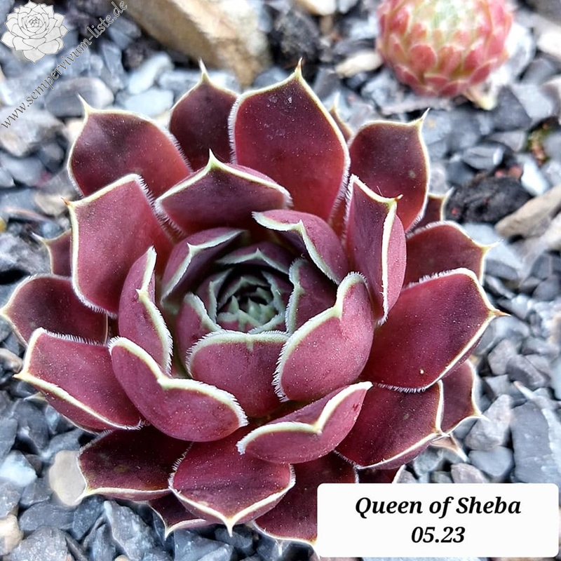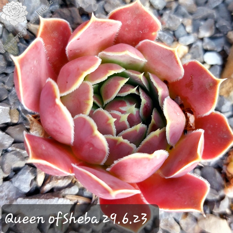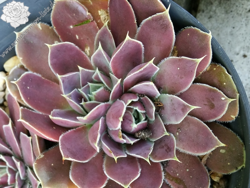 große Rosetten, Blätter spatelig, lang bespitzt, trübes Weinrot, Blattränder hell