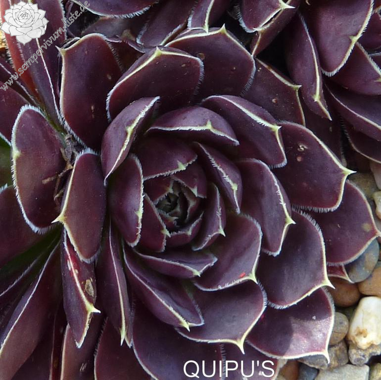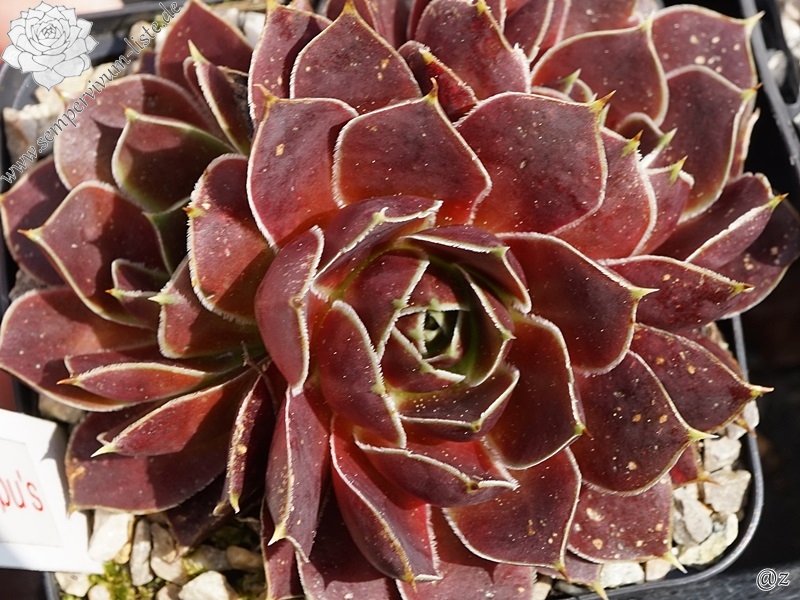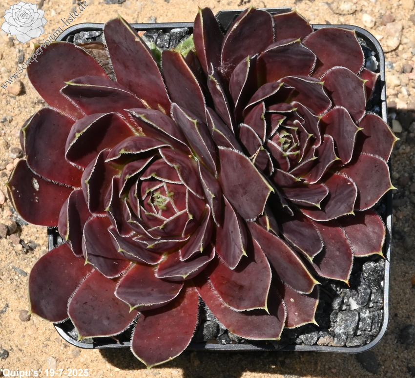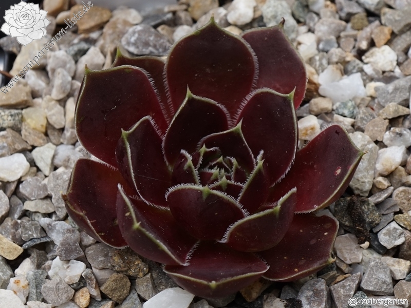 Rosetten bis 8 cm, Blätter breit spatelig, kurz bespitzt, dunkles Rotlila, Blattränder hell, bewimpert