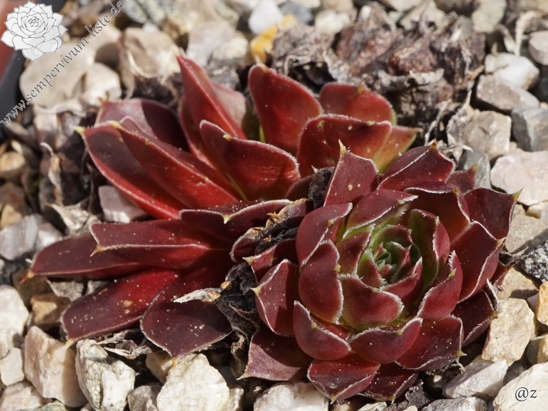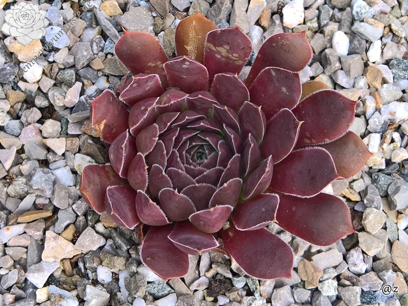 Rosetten bis 6 cm, Blätter oval lang bespitzt, bordeauxviolett, Blattränder bewimpert