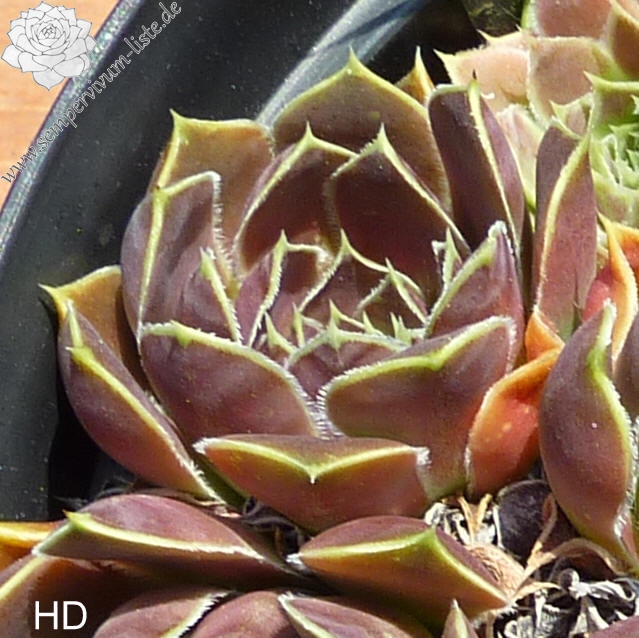 Rosetten 5 cm, Blätter eiförmig, kurz bespitzt, altrosa - trübes Rot , Blattränder gelb, bewimpert