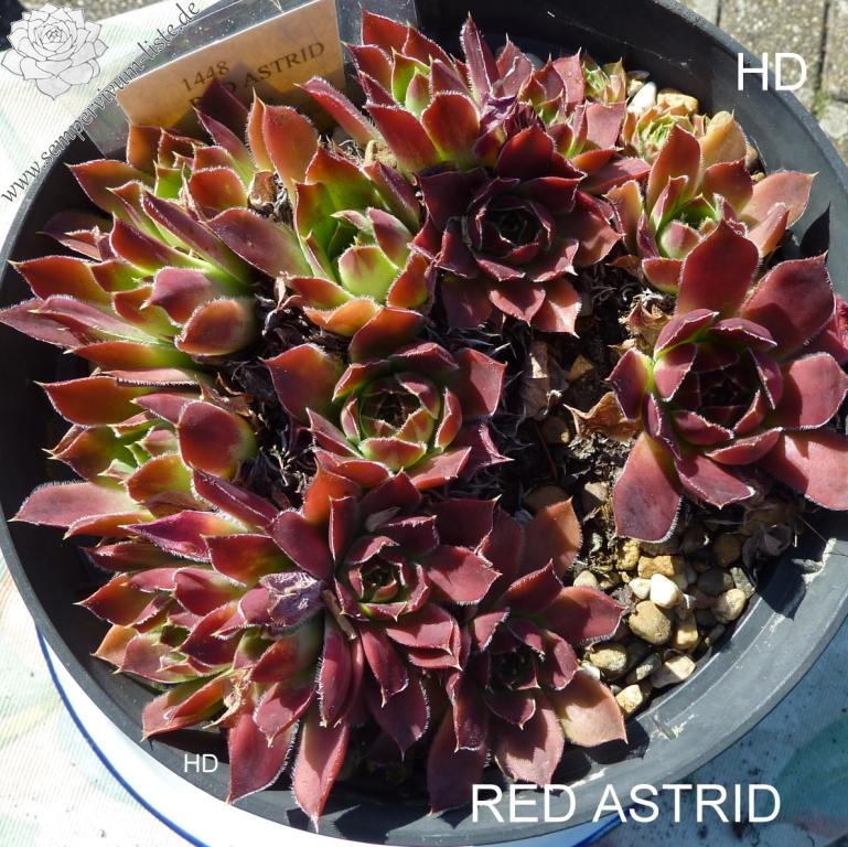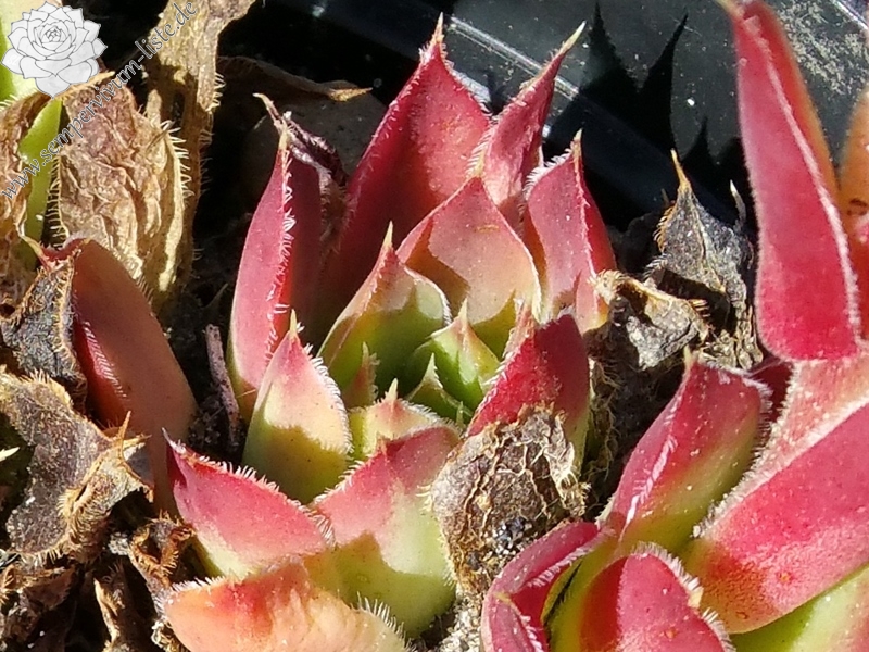 benannt nach der Tochter Astrid , Rosetten 6 cm, Blätter lanzettlich, lang bespitzt, leuchtendes Rot, Blattränder bewimpert