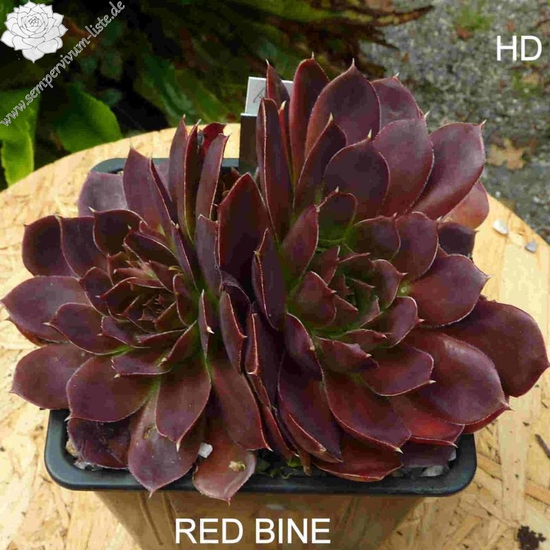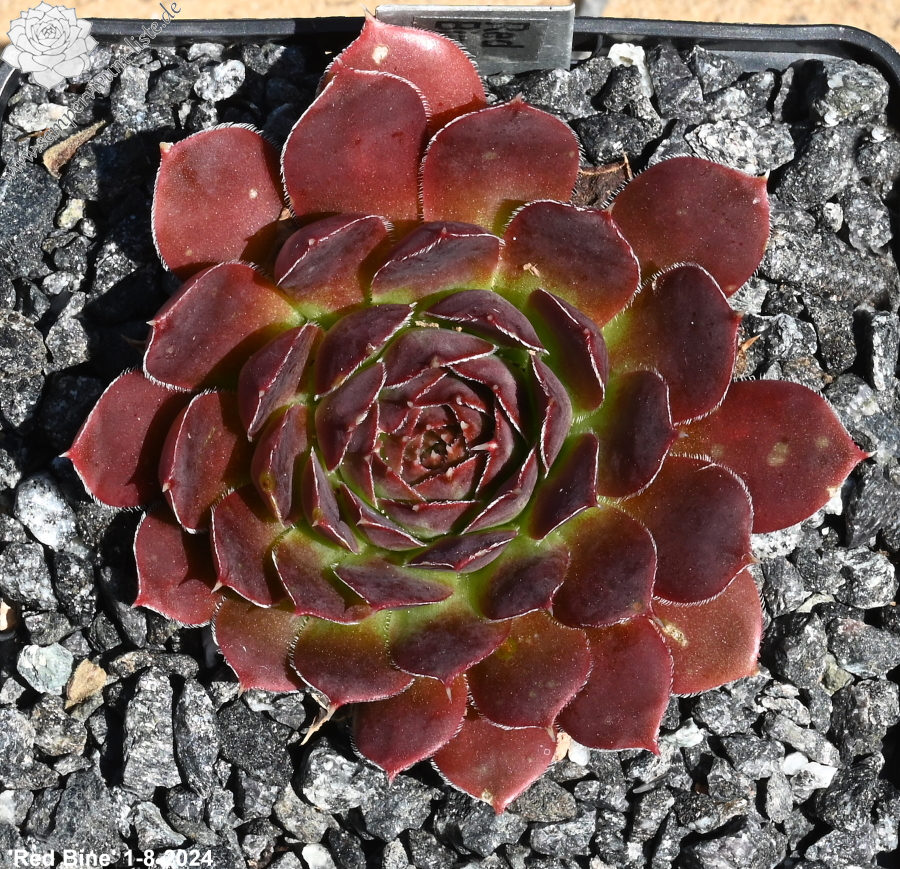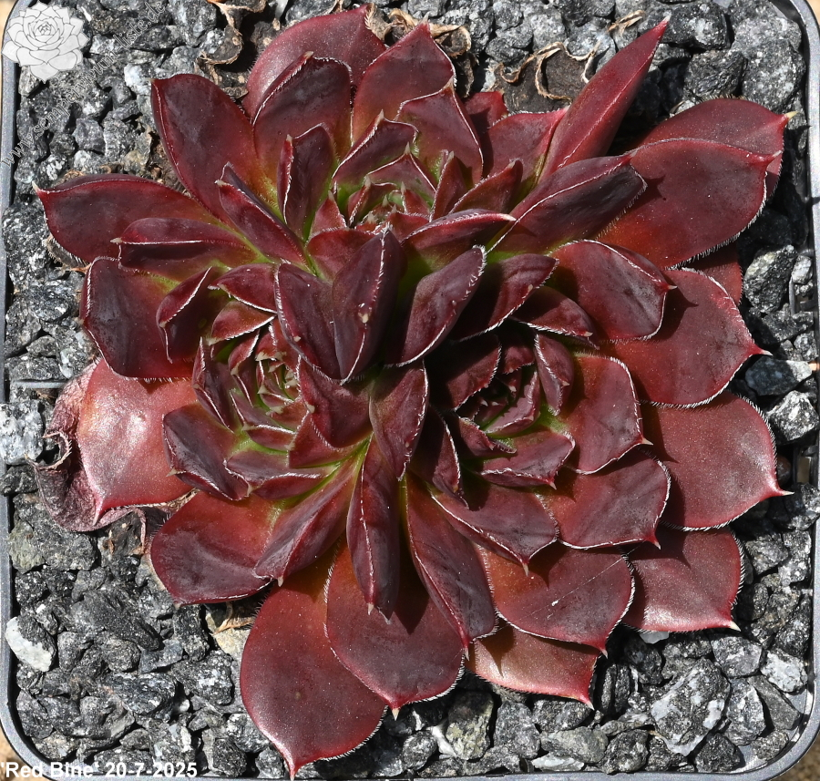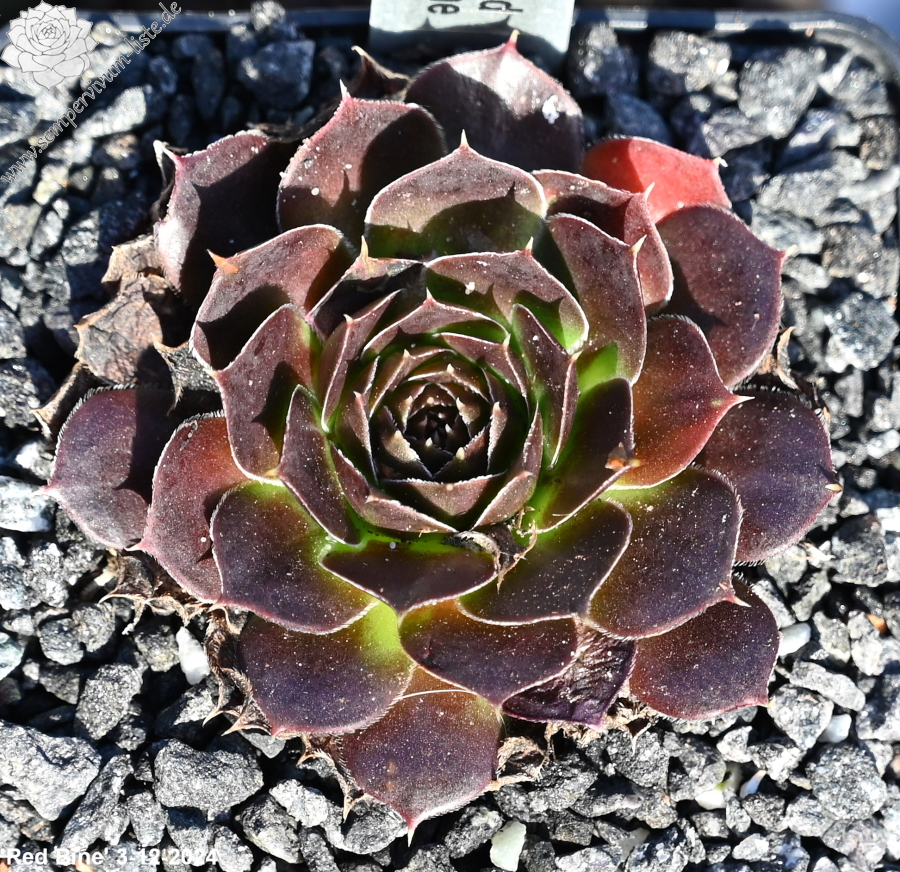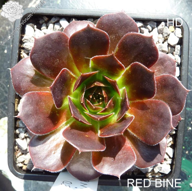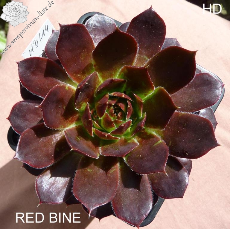 offene Rosetten bis 12 cm, Blätter keilförmig, kurz bespitzt, Basis helles grün, Rest rot - braun, später im Jahr dunkler werdend, Blättränder bewimpert, Zufallssämling, Aussaat 2000, benannt nach der Tochter des Züchters, Frau Bine (Sabine) Schwaldt.