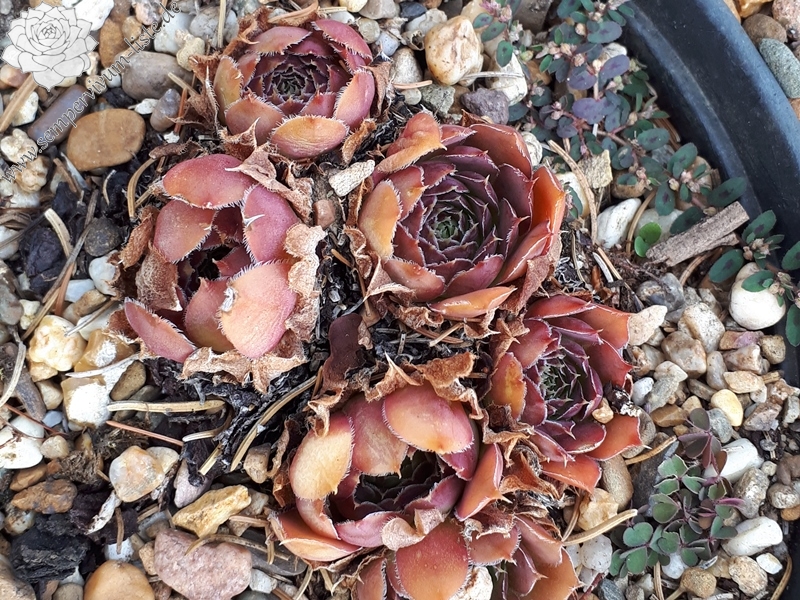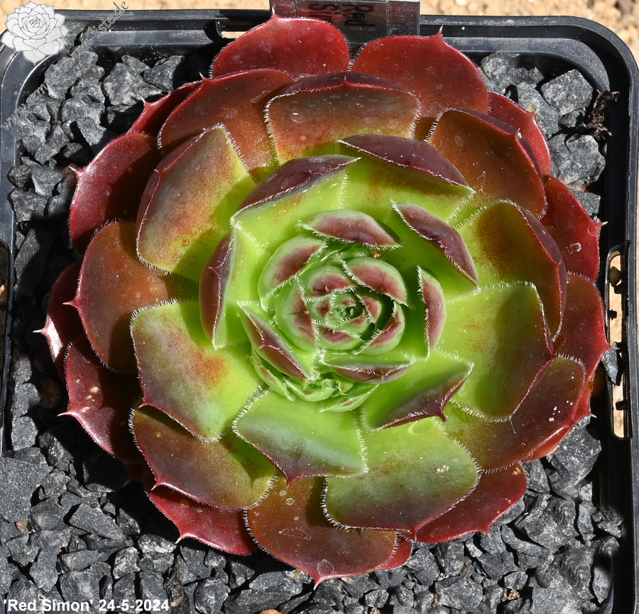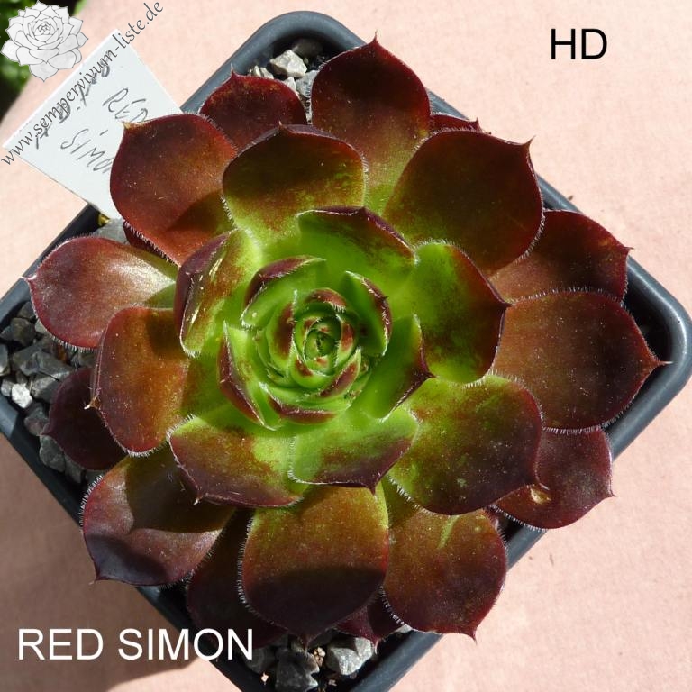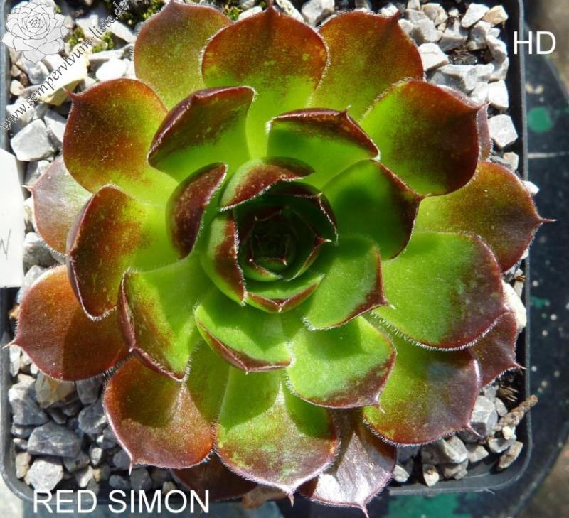 Rosetten bis 12 cm, Blätter spatelig, kurz bespitzt, Basis helles grün, in marmoriertes braun - rot übergehend / Zufallssämling, Aussaat 1999, benannt nach Simon Schwaldt