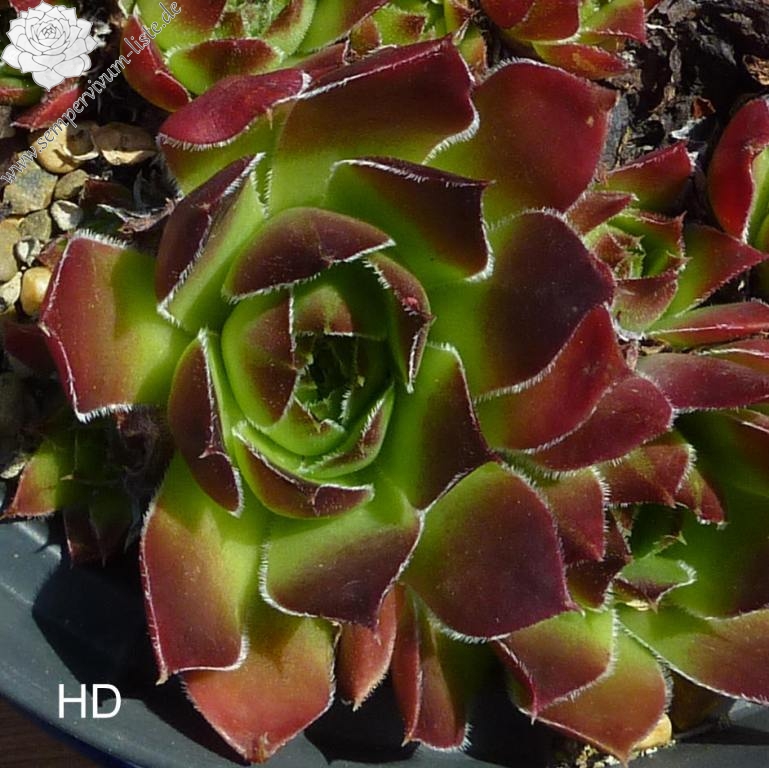kleine Rosetten, Blätter oval, lang bespitzt, Basis lindgrün, Rest dunkelrot - braun, Ränder bewimpert