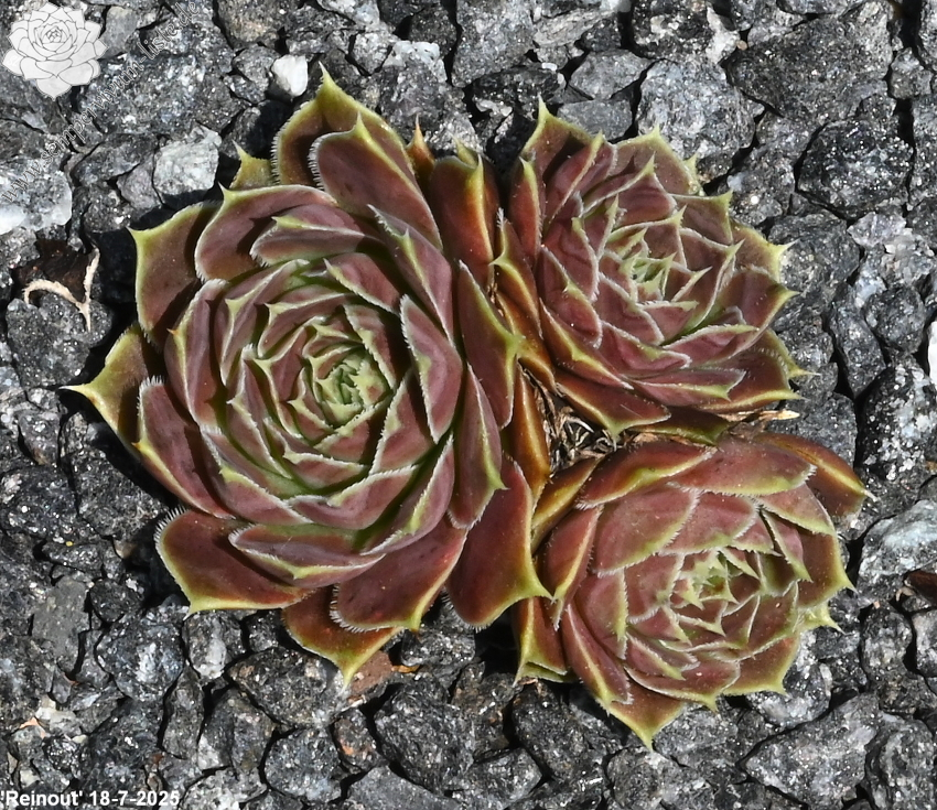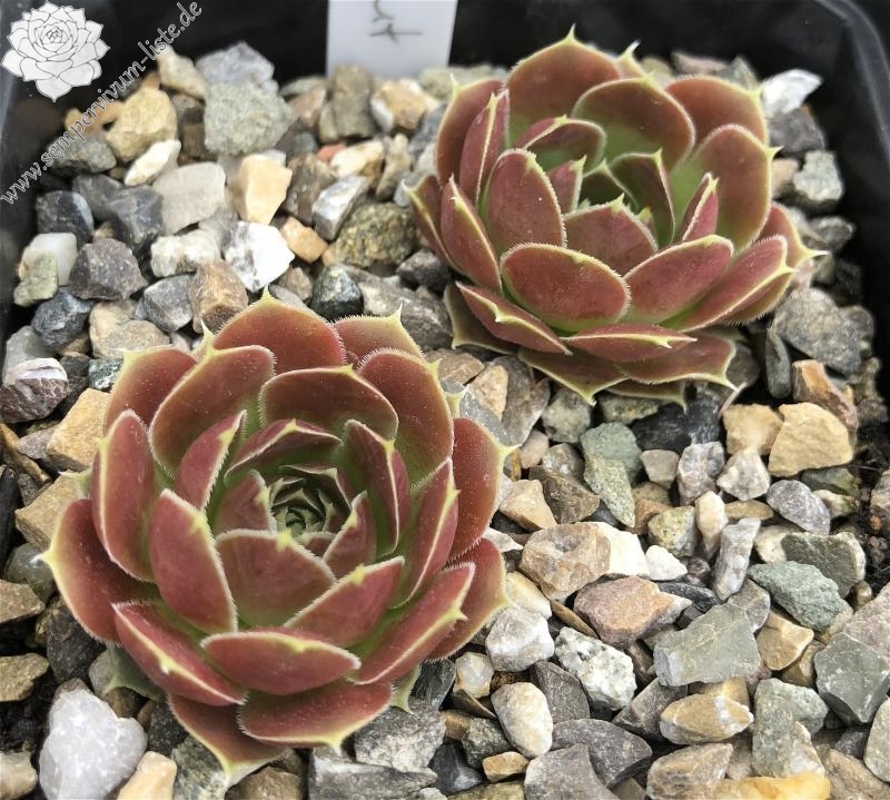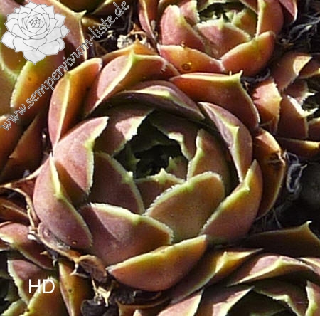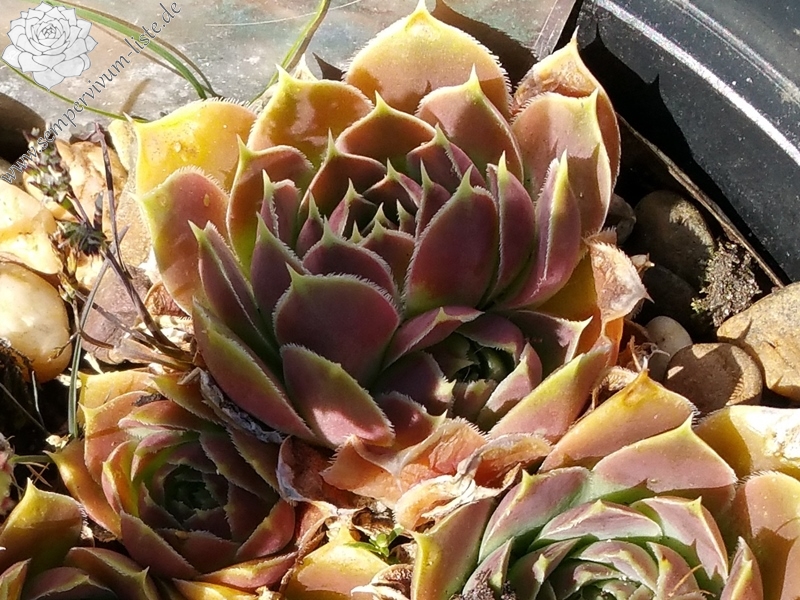 kleine kompakte Rosetten, Blätter eiförmig, kurz bespitzt, Mischfarben gelb - altrosa, Ränder gelblich