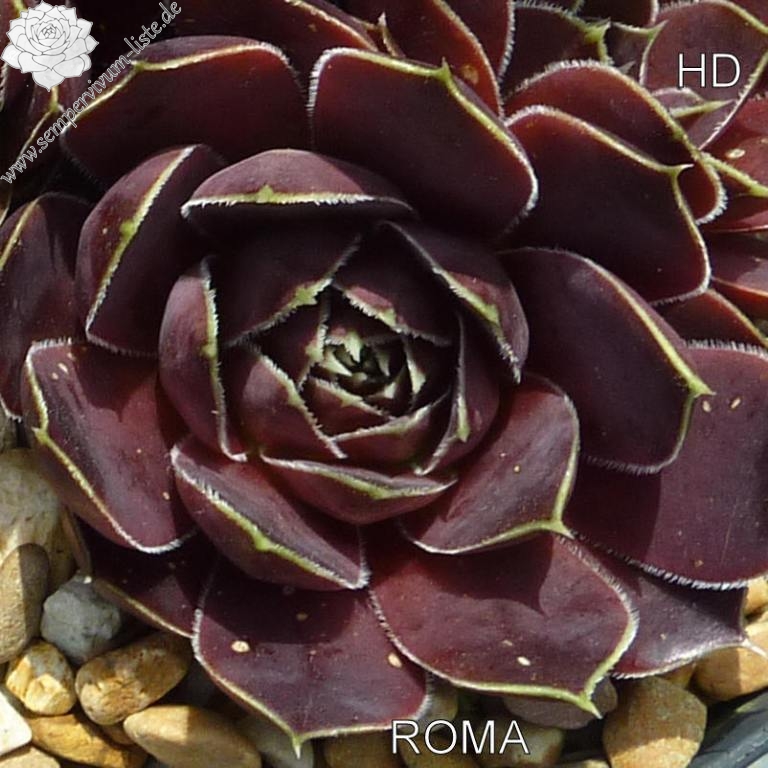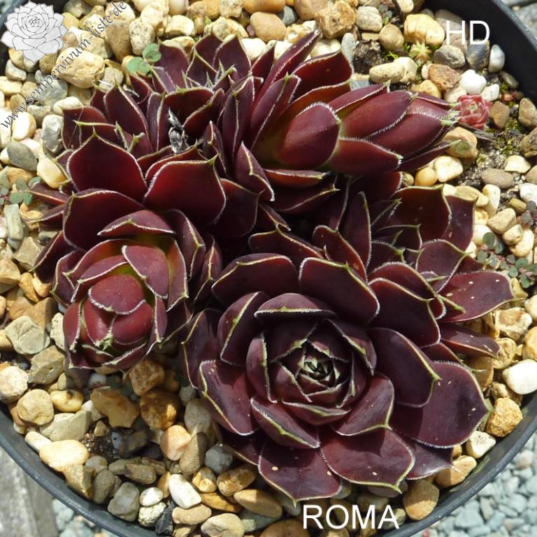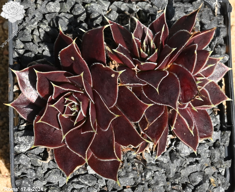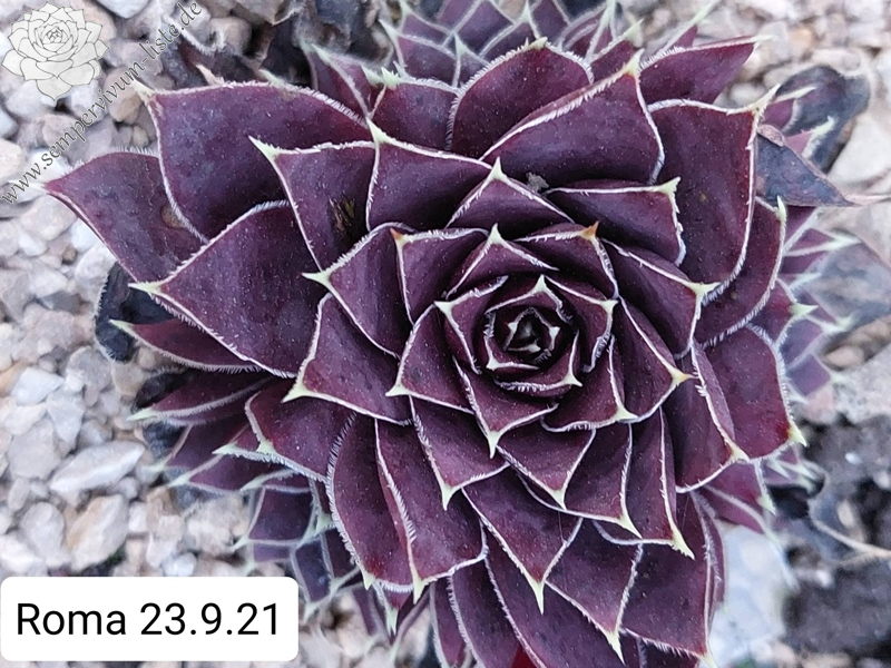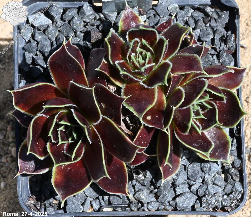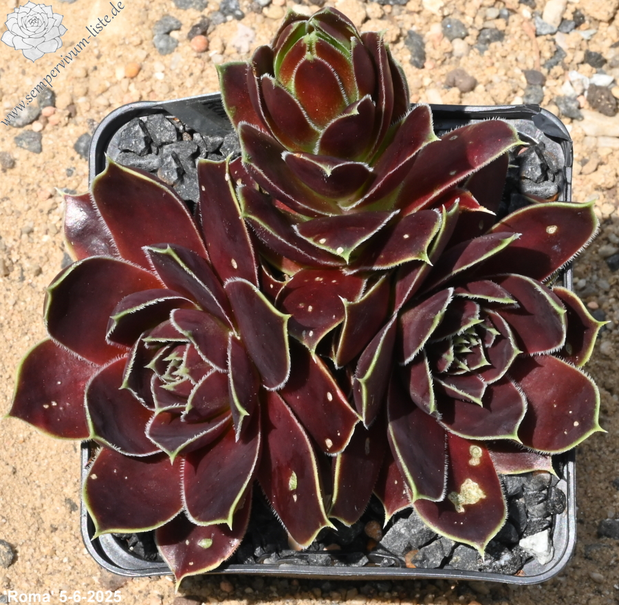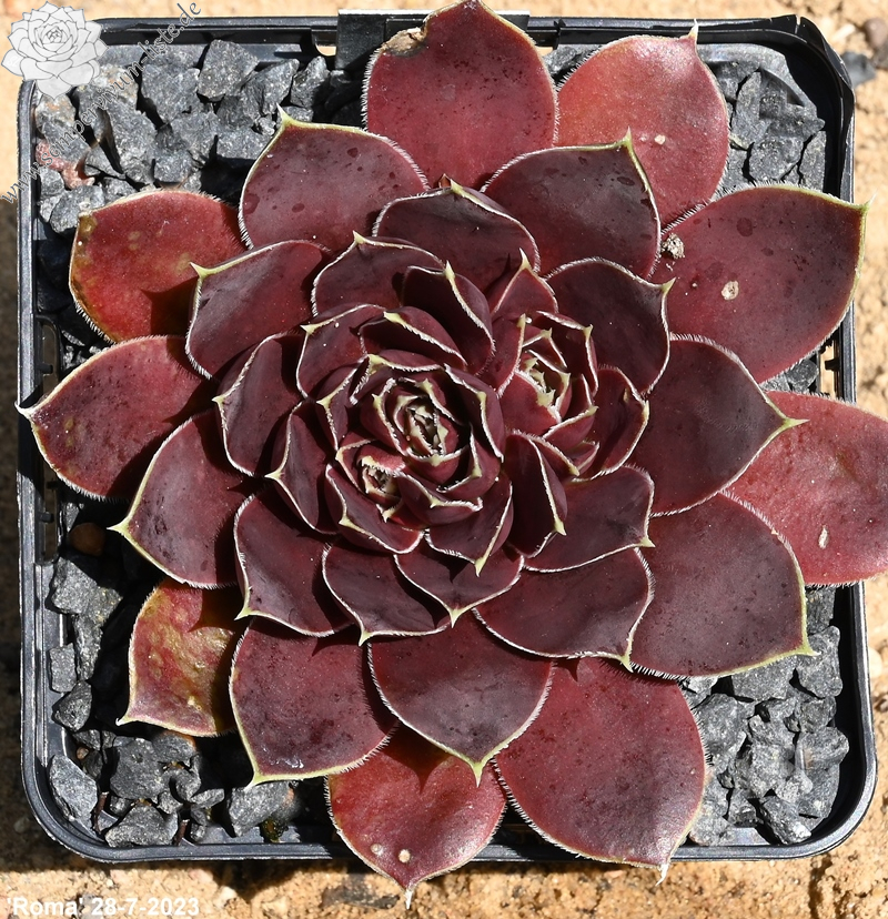 Rosetten bis 6 cm, Blätter oval, lang bespitzt, bordeauxviolett, Blattränder hell, bewimpert