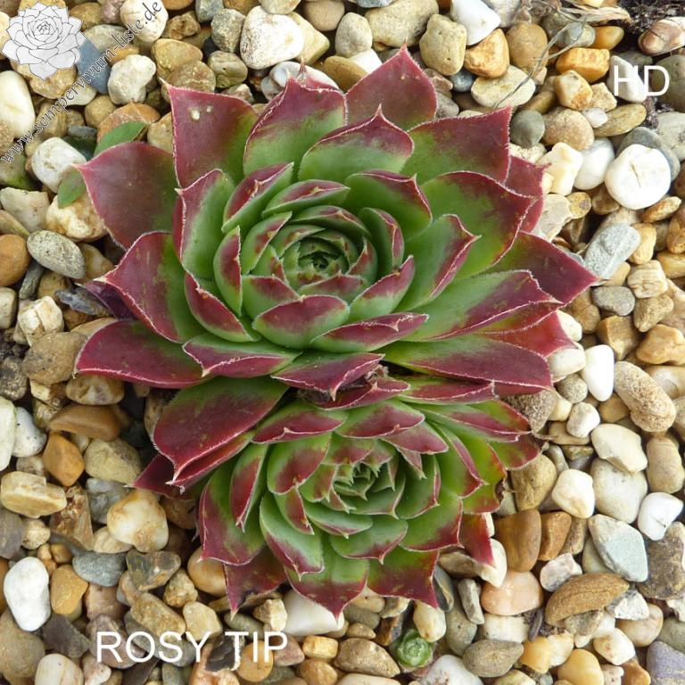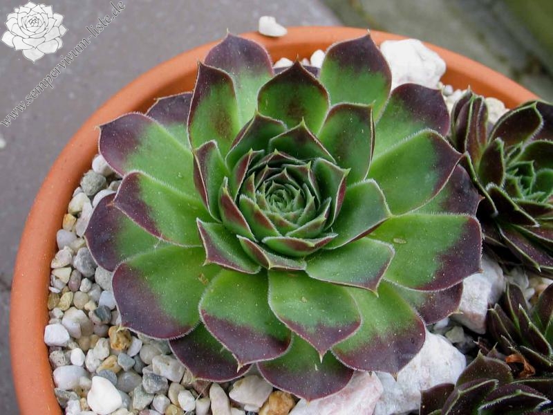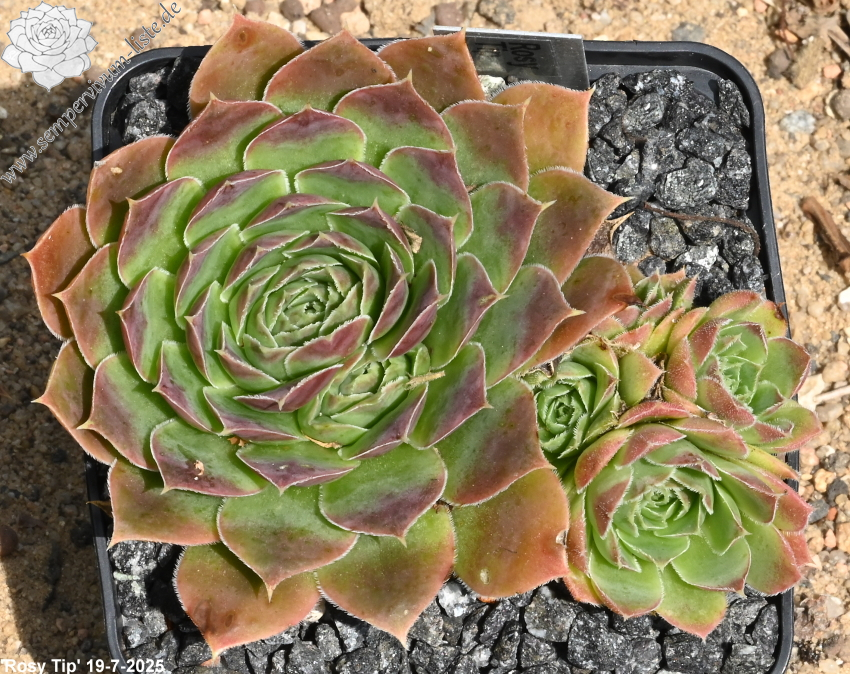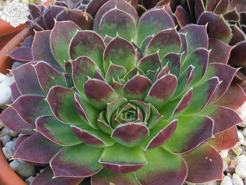 Rosetten bis 6 cm, Blätter breit lanzettlich, lang bespitzt, Basis hellgrün, obere Blattdrittel braunrot - rotlila , Blattränder bewimpert