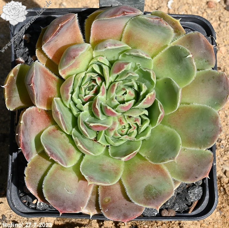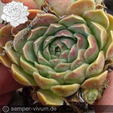 Jadegrüne Rosetten mittlerer Größe. Das Ende der Blätter ist teilweise auf ihrer Unterseite hellrosa überhaucht, während das auf Ihrer oberen Seite kaum zu beobachten ist.