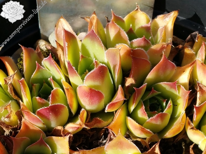 Ros. 4 cm, hellgrün, rote Spitzchen, Bl. gelb
