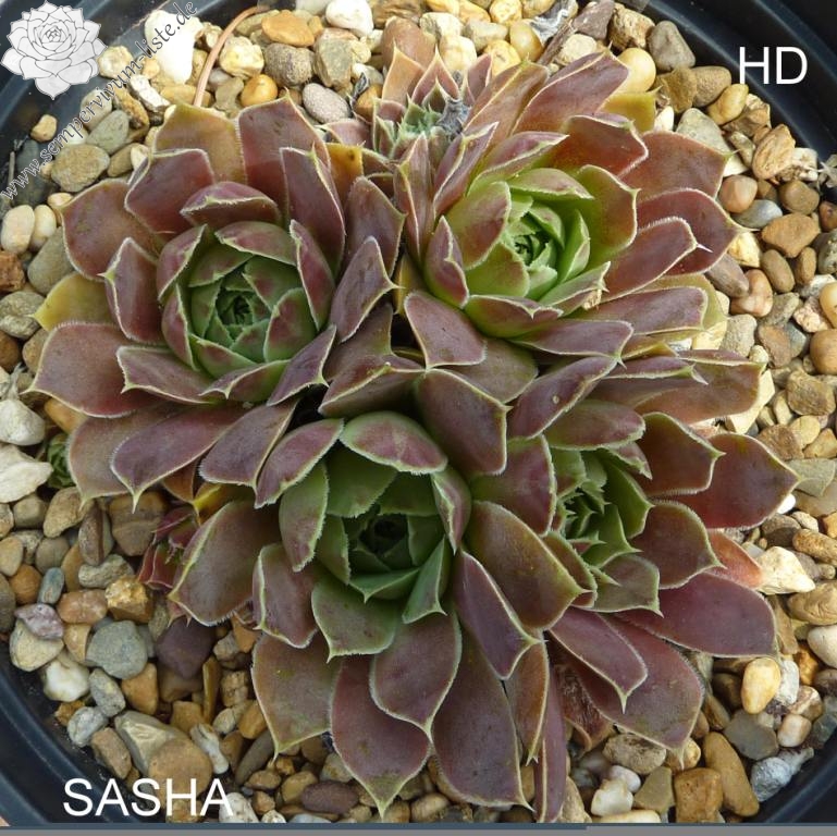 große Rosetten, Blätter linealisch, lang bespitzt, Basis oliv, Rest trübes Lila, Ränder bewimpert