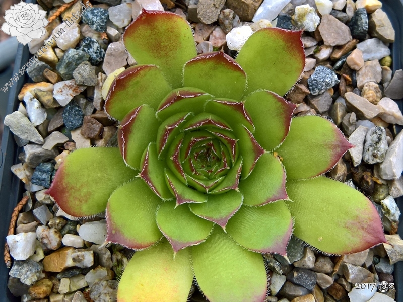 Zufallssämling / Rosetten bis 6 cm, Blätter linealisch, lang bespitzt, Basis lindgrün, obere Drittel helles Rot, gewidmet Frau Sigrid Lenhard
