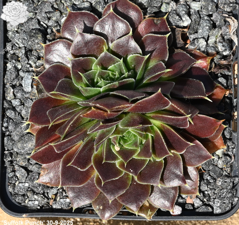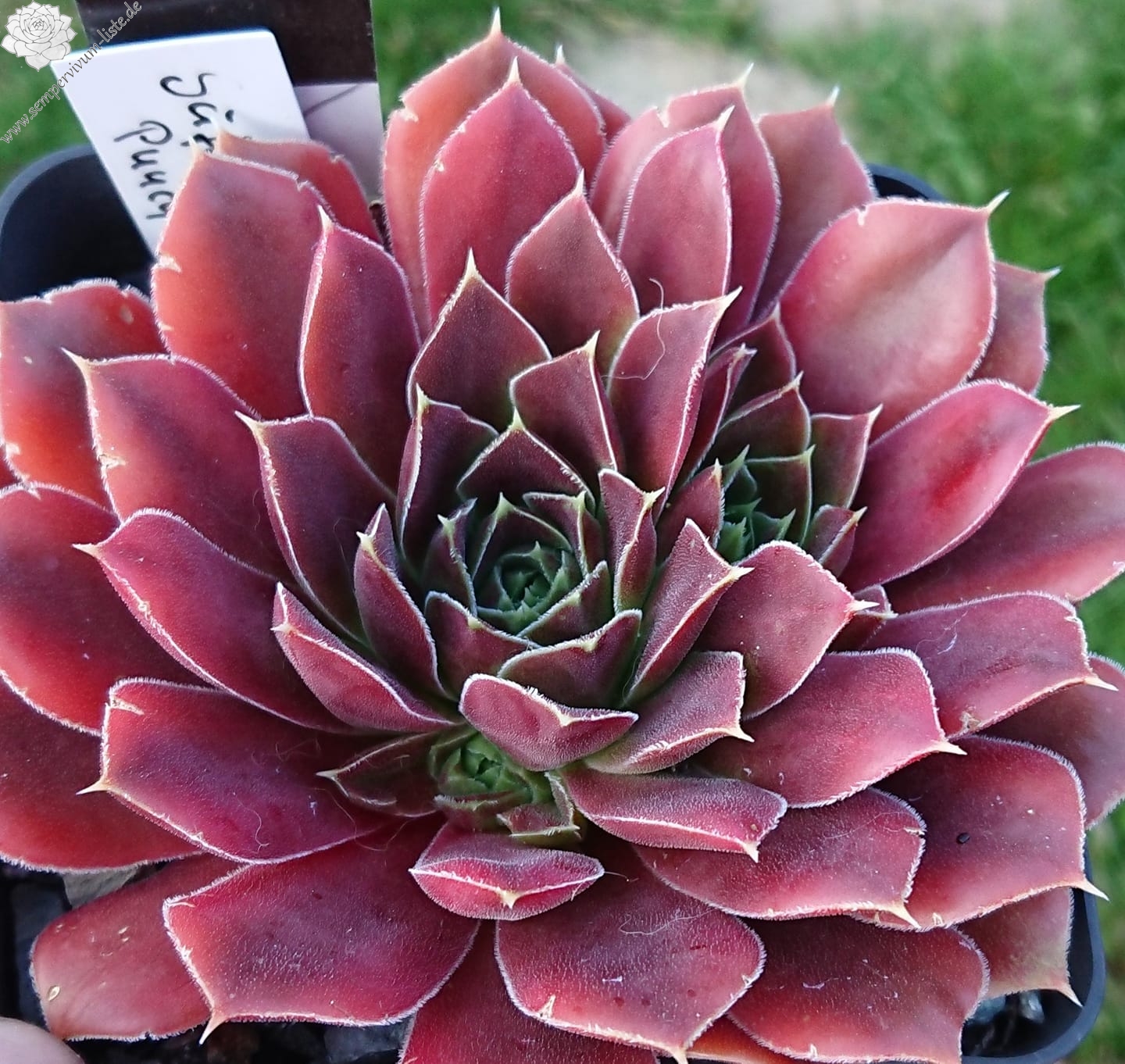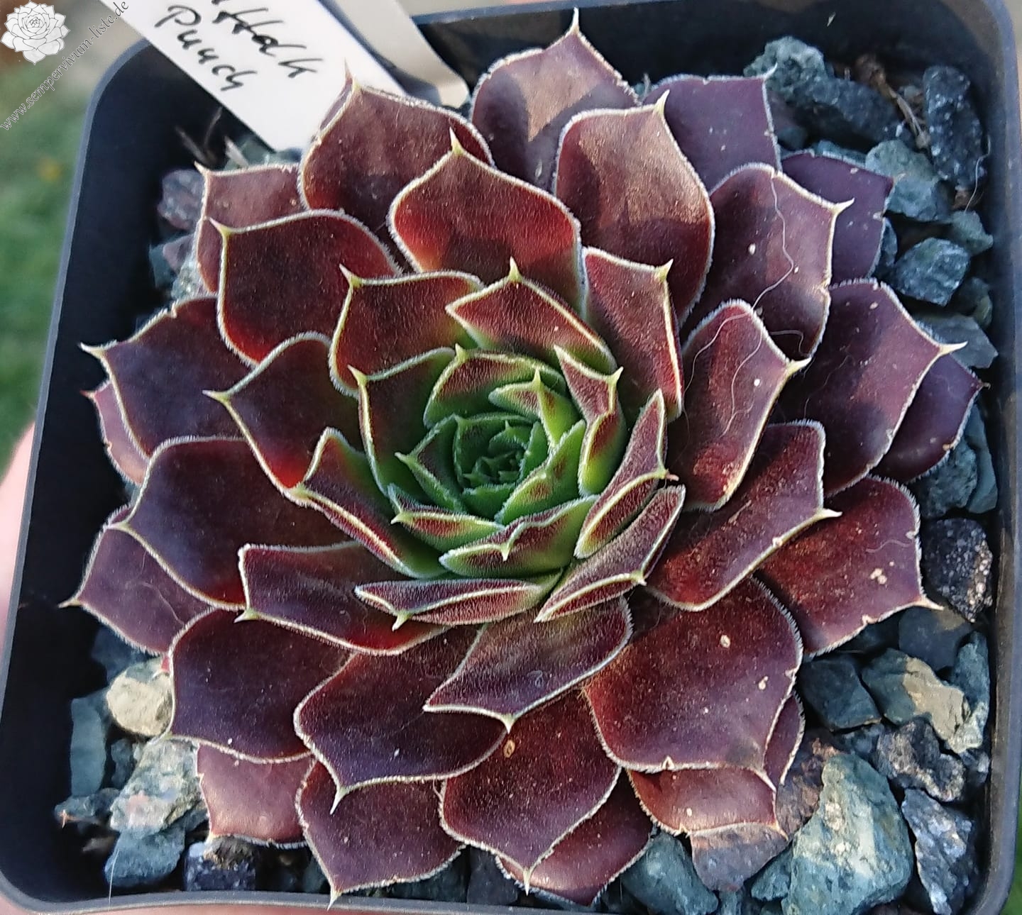 Rosetten bis 7 cm, Blätter oval, lang bespitzt, braunrot - weinrot, Herz hellgrün, Blattränder hell, bewimpert
