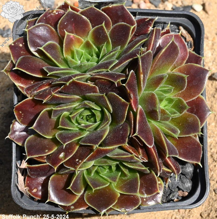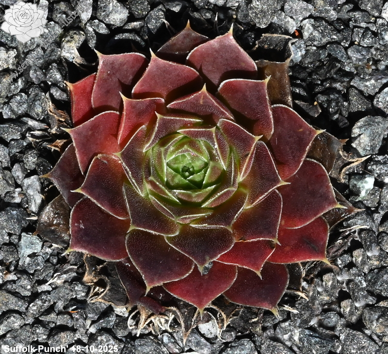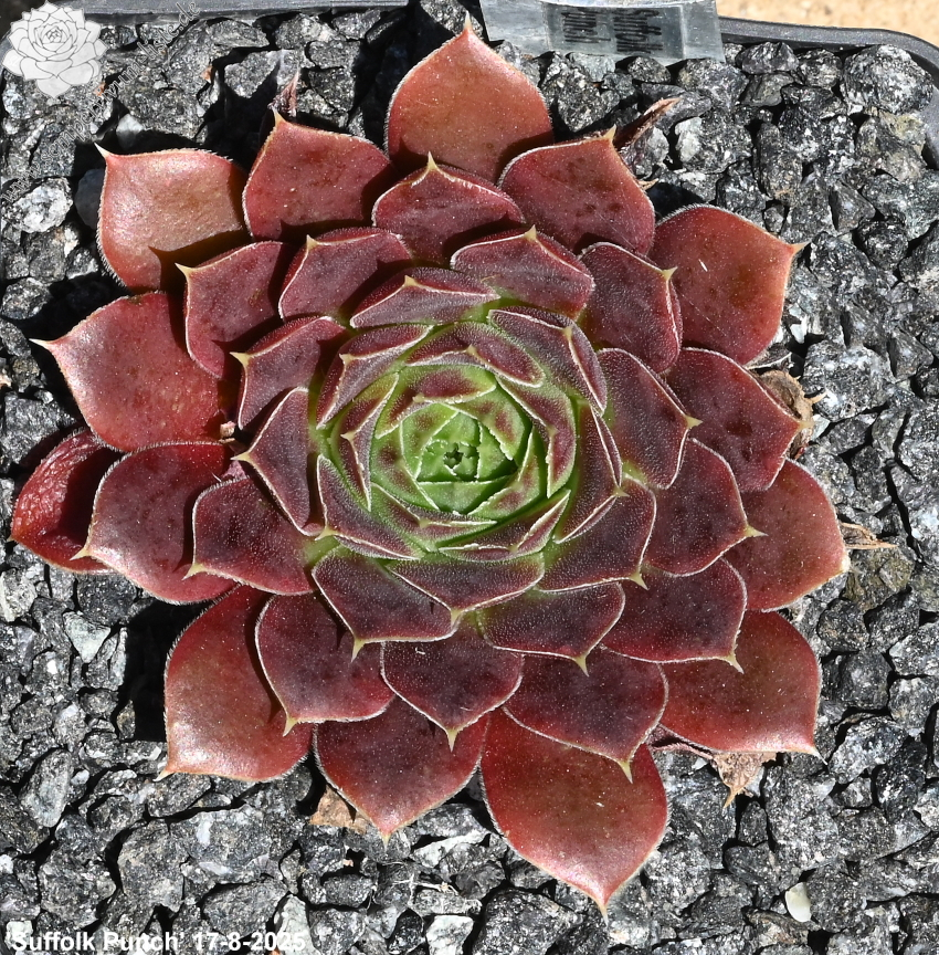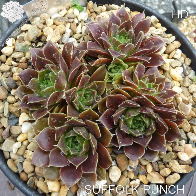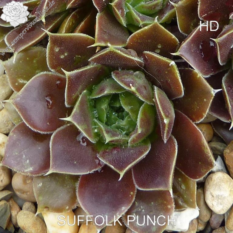 Rosetten bis 7 cm, Blätter oval, lang bespitzt, braunrot - weinrot, Herz hellgrün, Blattränder hell, bewimpert