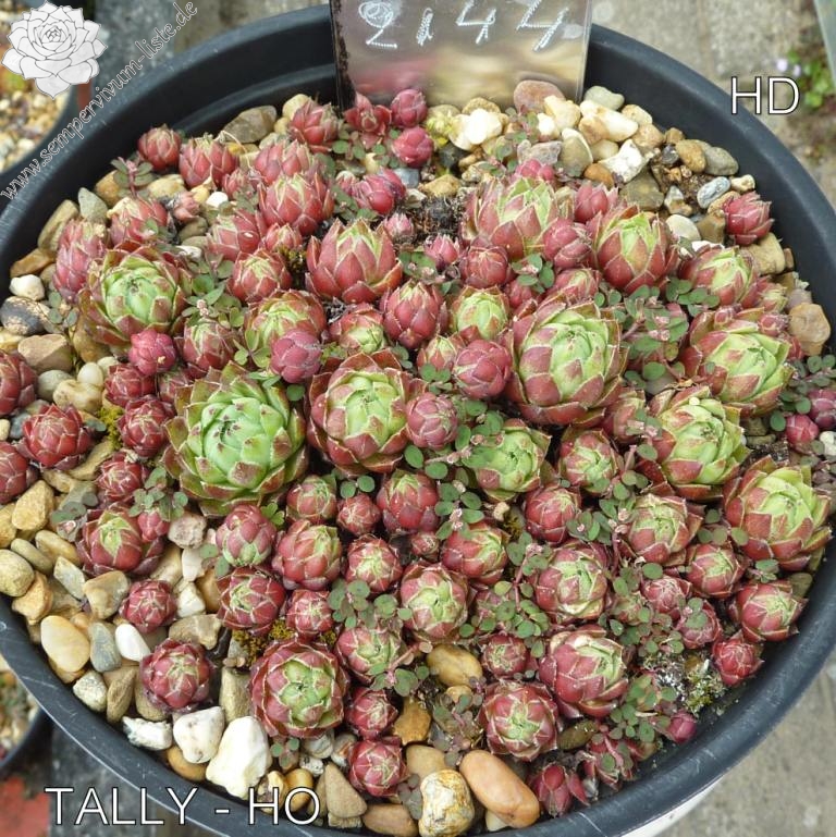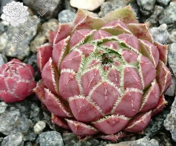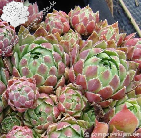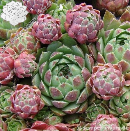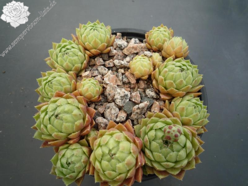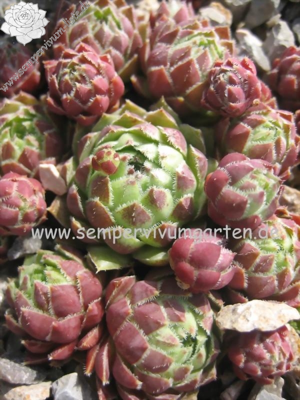 Eine noch unbekannte Auslese aus dem Jahre 2002: Kugelige, jadegrüne Rosetten mit stark bewimpertem Laub, das zum Spätsommer Ihre Färbung auf der Blattunterseite in purpurnes Rosa wechselt.