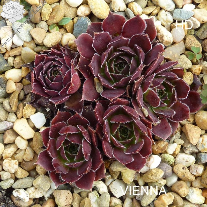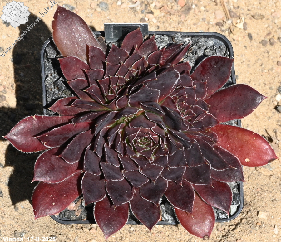 Rosetten bis 4 cm, Blätter oval, kurz bespitzt, purpurrot - rubinrot, Blattränder bewimpert