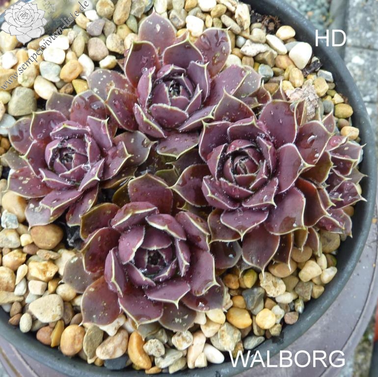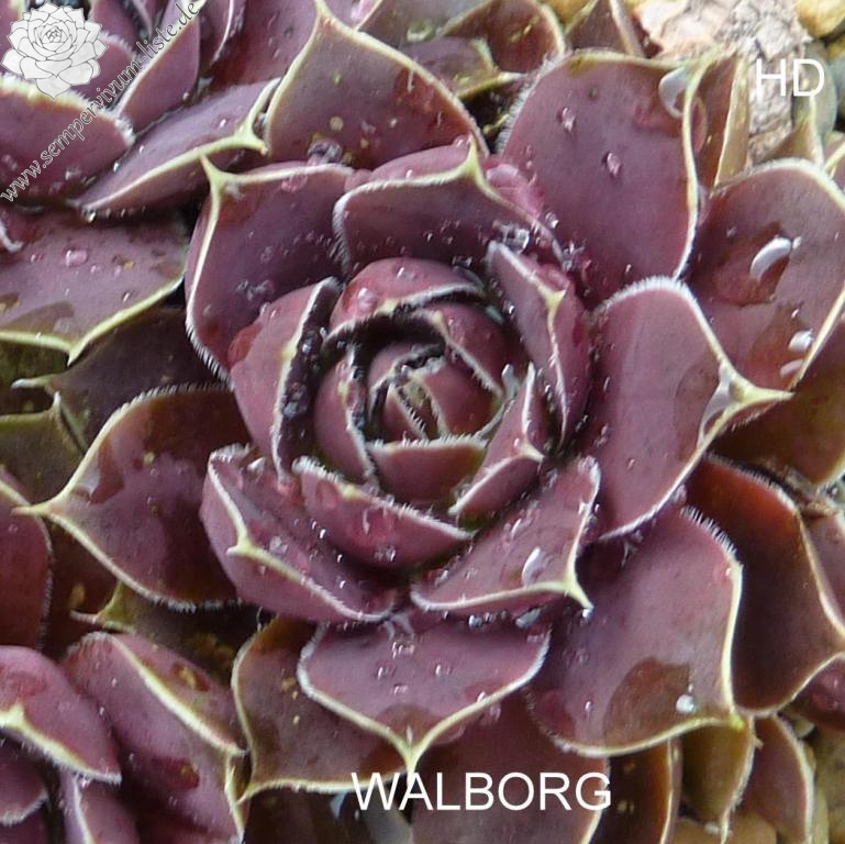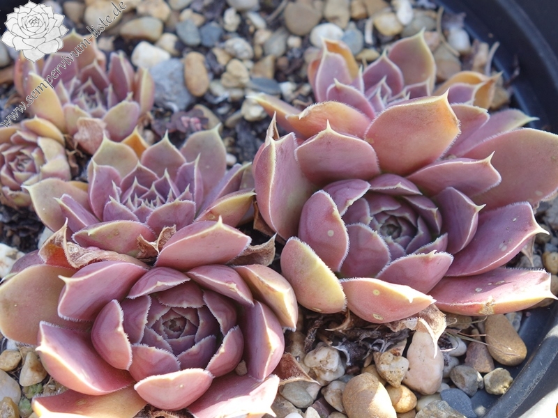 Rosetten bis 7 cm, Blätter oval, lang bespitzt, signalviolett, Blattränder hell, bewimpert