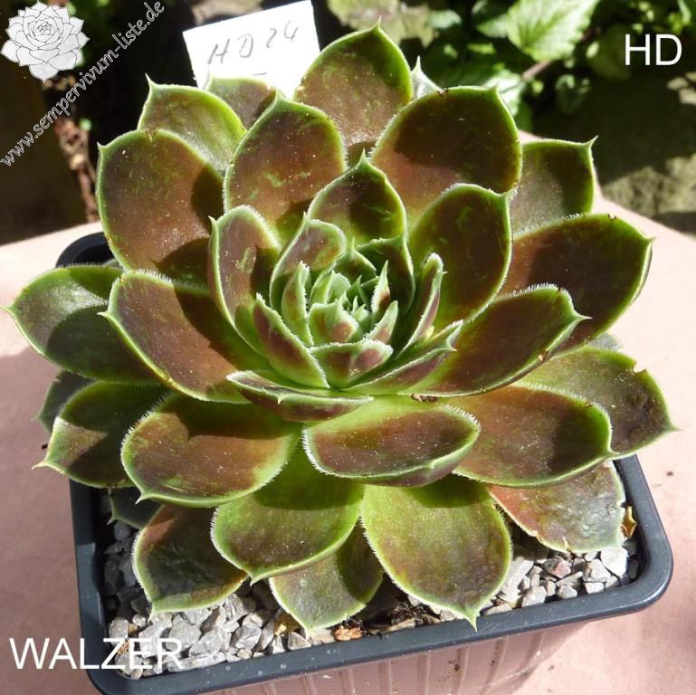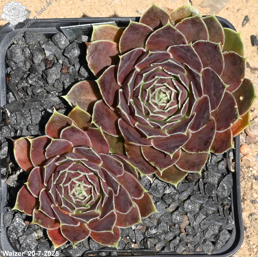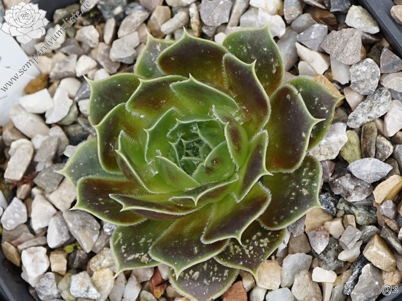 Rosetten bis 10 cm, Blätter eiförmig, kurz bespitzt, helles grün mit rosa - braun panaschiert, Blattränder grün, leicht bewimpert, Zufallssämling, Aussaat 1999
