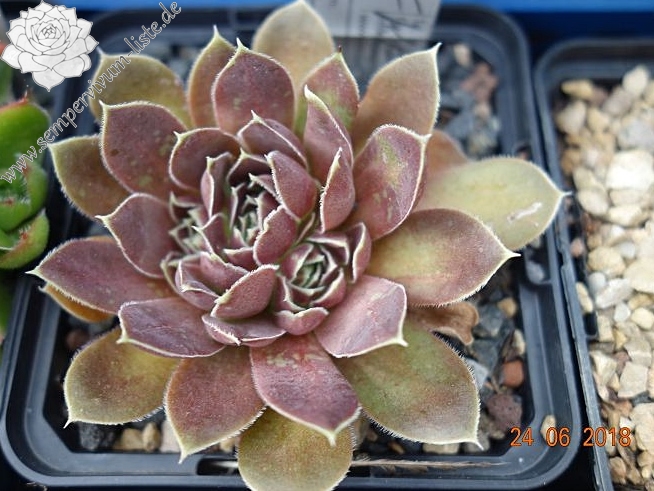 Rosetten bis 7 cm, Blätter oval, kurz bespitzt, Mischfarben dunkles grün - blaulila, Blattränder grünlich