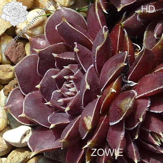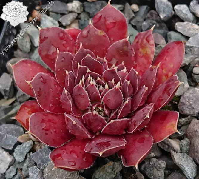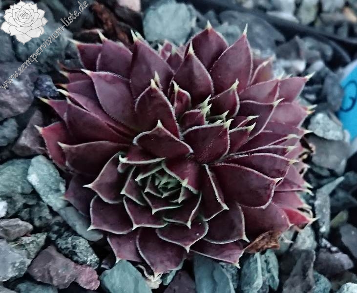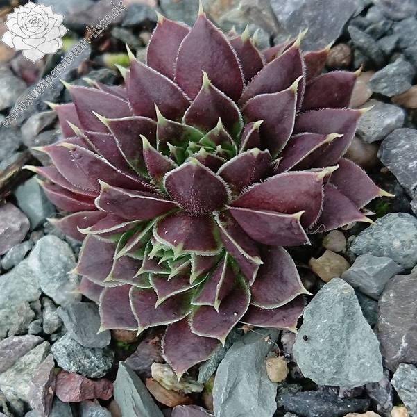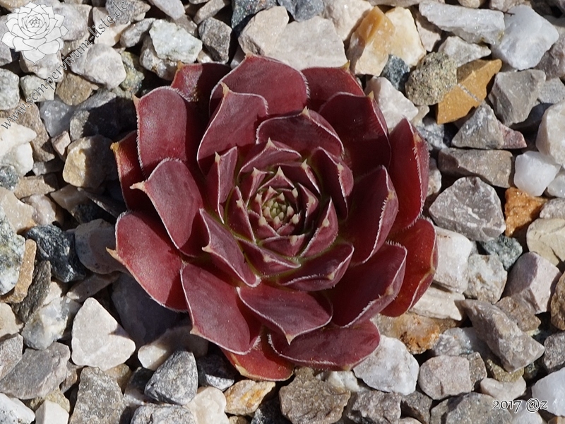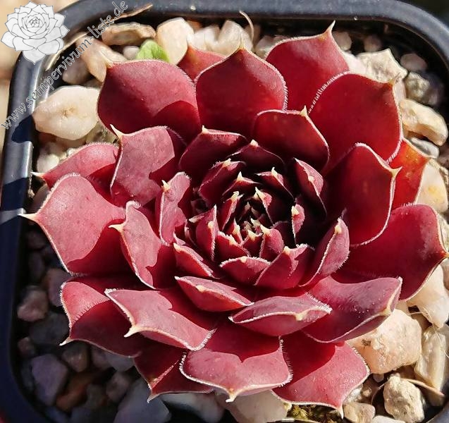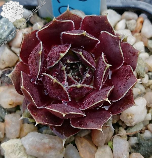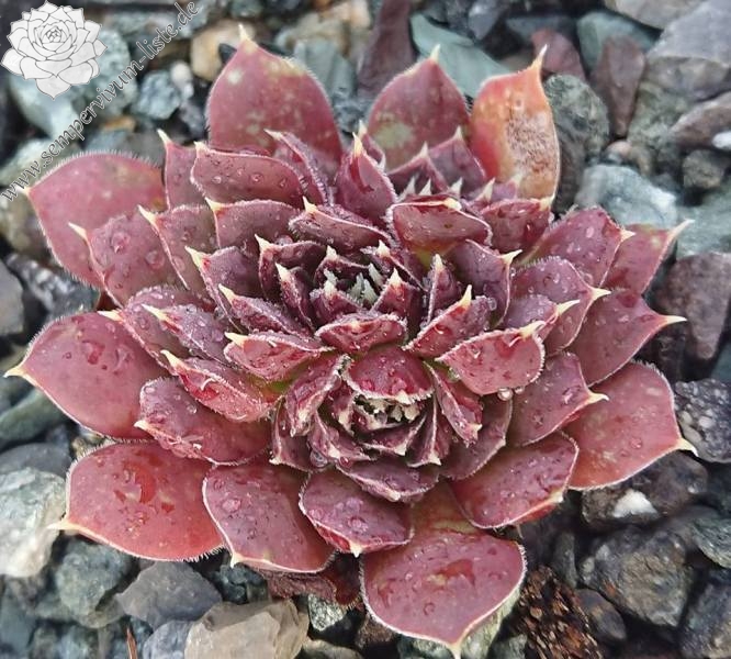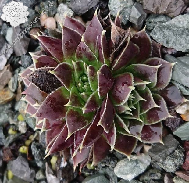 kleine Rosetten, Blätter breit keilförmig, kurz bespitzt, weinrot - purpurrot, Blattränder hell