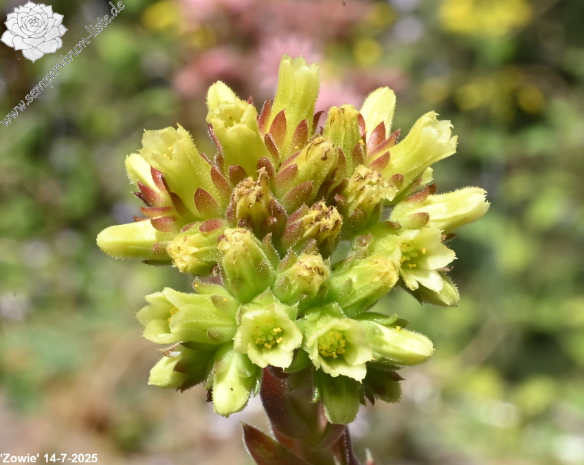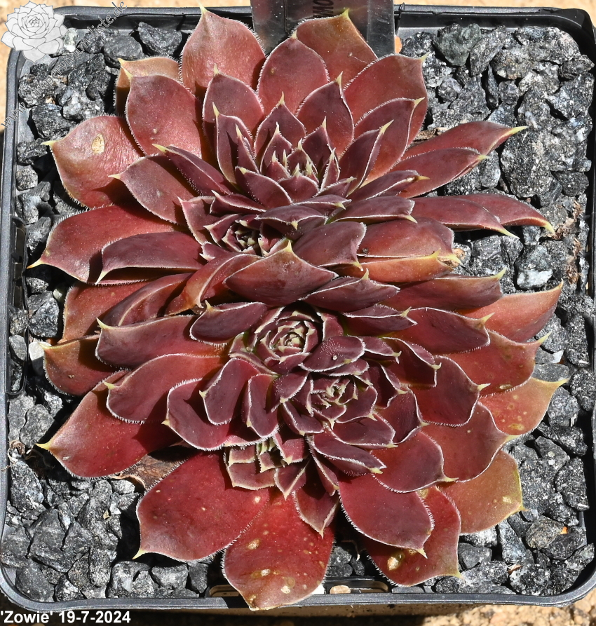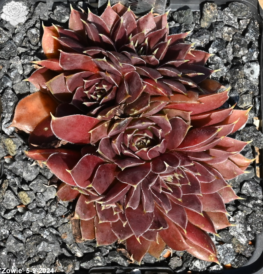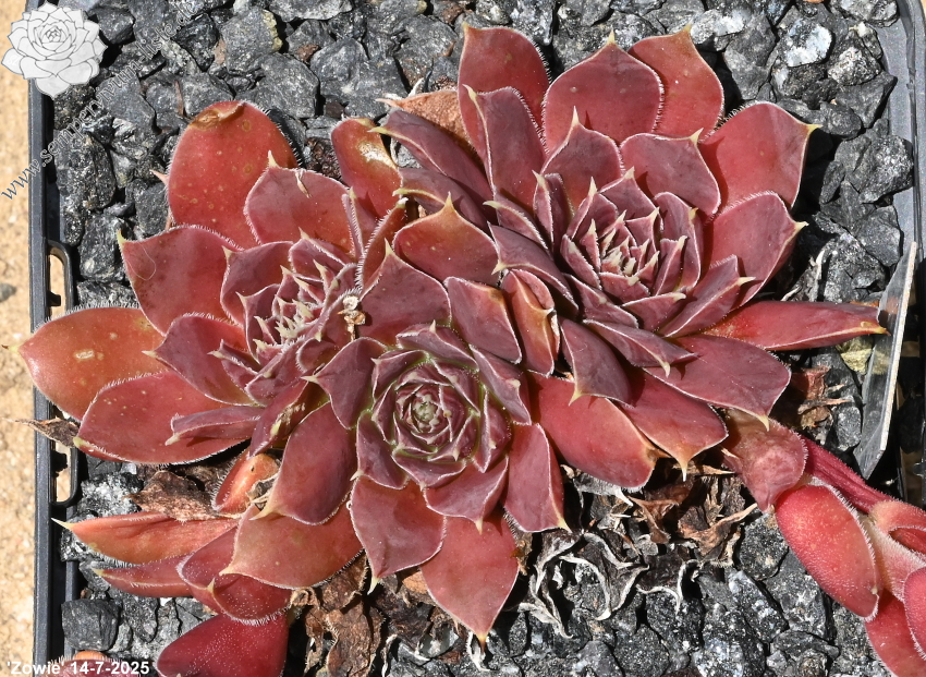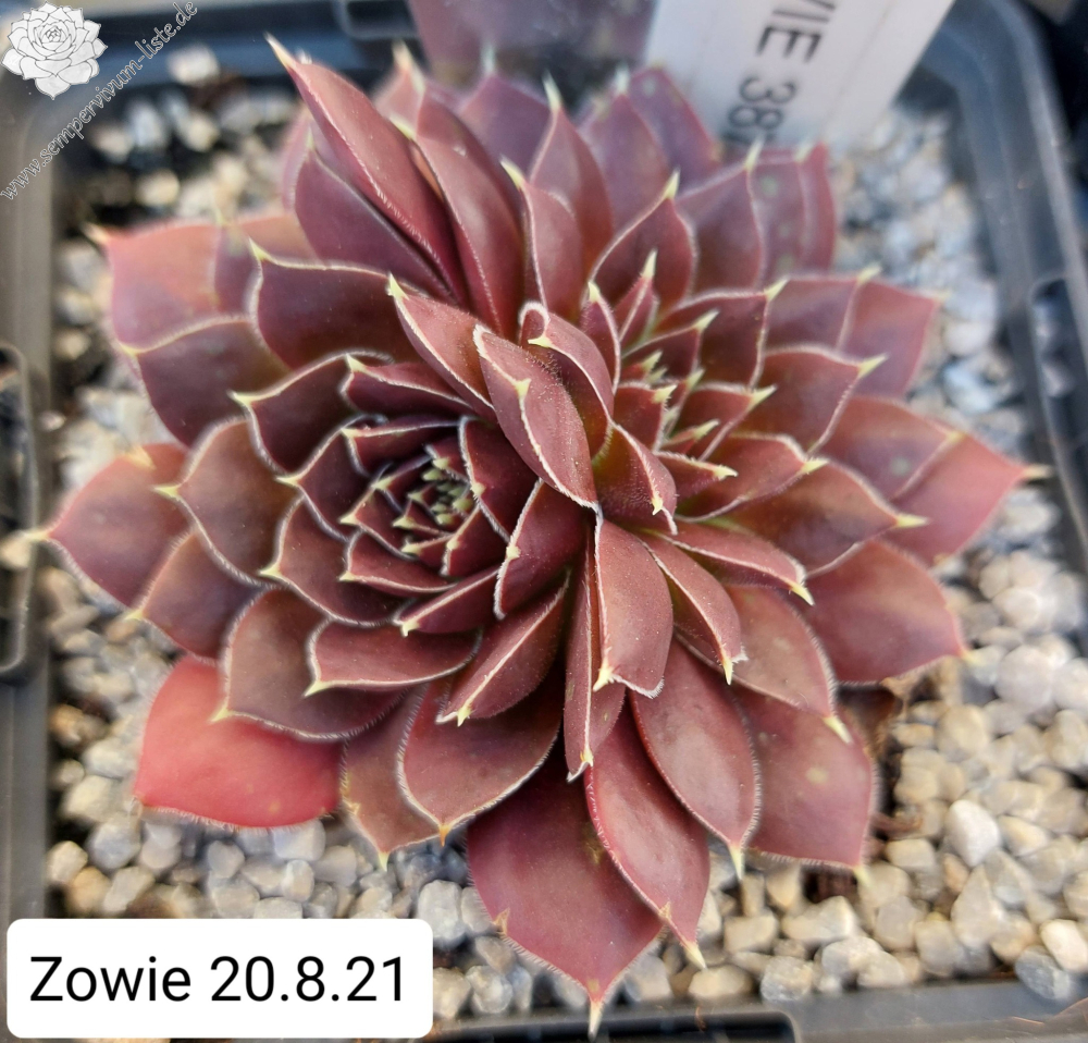 kleine Rosetten, Blätter breit keilförmig, kurz bespitzt, weinrot - purpurrot, Blattränder hell