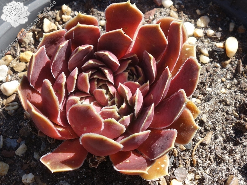 kleine Rosetten, Blätter breit spatelig, kurz bespitzt, weinrot - purpurrot, Blattränder hell grünlich