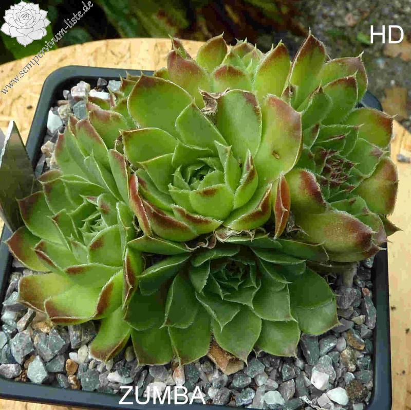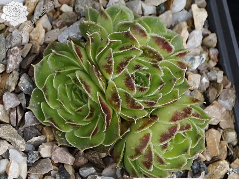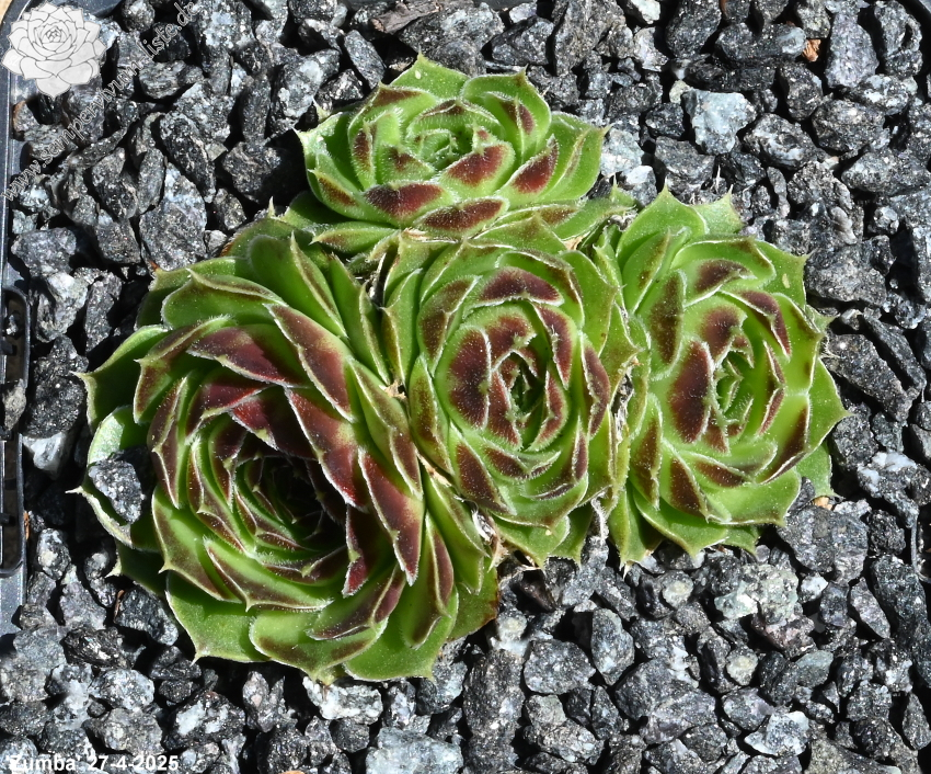 Rosetten bis 8 cm, Blätter rundlich, kurz bespitzt, Basis gelbgrün, Blattspitzen beigerot - altrosa, Blattränder bewimpert / Zufallssämling