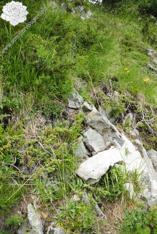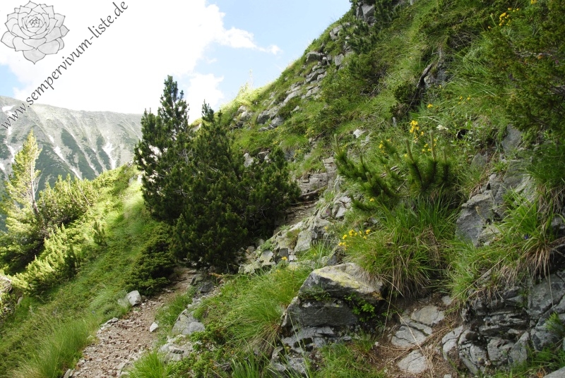 Gerade an den östlichen Abhang des Berges Vihren, neben dem touristischen Weg, habe ich einen weiteren Naturstandort von Sempervivum erythraeum gefunden. Der Naturstandort liegt an einen felsigen Teil des östlichen Abhanges von Vihren, fast an der obere Grenze des Waldes in der Höhe von 2190 Meter über dem Meerspiegel, das Gestein wird Granit gebildet. Der Naturstandort ist nicht so ausgedehnt, trotzdem wachsen da viele Rosetten von Sempervivum erythraeum. Die Rosetten wachsen vor allen in den Felsspalten, in den Lücken zwischen den Steinen, in der Nähe der großen Steine und auch teilweise im Gras bei der Steine. Einige Rosetten wachsen ganz im Schatten unter den Ästen der Wacholder.