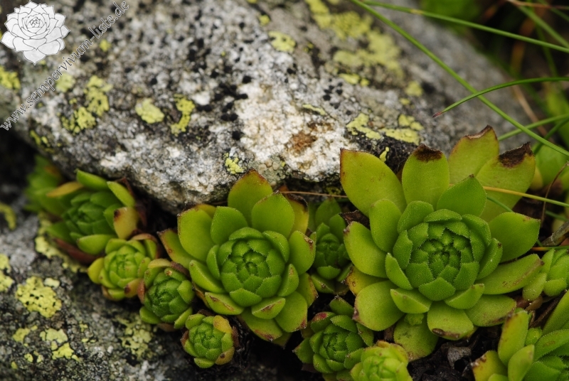 Am Naturstandort habe ich eine riesengroße Anzahl der Rosetten aller Größen beobachtet. Viele Rosetten wachsen in den Gruppen und in den großen Kolonien. Die Rosetten von Sempervivum montanum ssp. carpathicum besiedeln da die Ränder des steinernes Ortes. Da wachsen an den Steinen, zwischen den Steinen und auch um die Steine. Einige Rosetten wachsen ein in der Nähe der Steine teilweise im Gras.