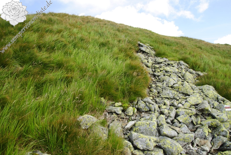 Unter dem Berg Bystrá, schon in dem Hauptgebirgskamm des Gebirges gibt es gleich unter dem Berg Bystrá ein Sattel, dieser Sattel heißt Bystré sedlo (sedlo = Sattel, also Sattel von Bystrá auf Deutsch). Der Sattel liegt in der Höhe von 1946 Meter. Ein bisschen westlich von dem Sattel steigt der Hauptgebirgskamm ein bisschen, der touristische Weg da durch einen Ort mit den festen Steinen. Ein wunderschöner Ort für Hauswurz, da habe ich Sempervivum montanum ssp. carpathicum gefunden und auch beobachtet.