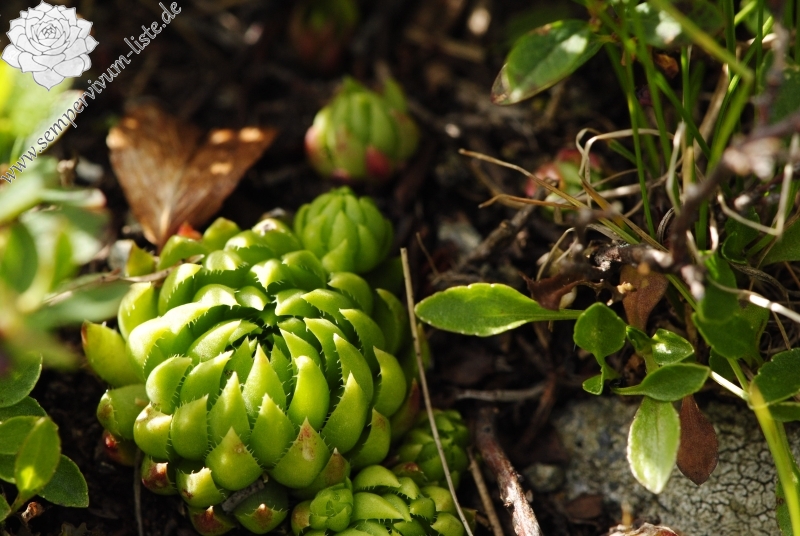 Die Rosettenblätter sind in meisten Fällen frisch grün gefärbt, bei einiger Rosetten werden die oberen äußeren Drittel der Rosettenblätter rot gefärbt, die Spitzen der Rosettenblätter sind in vielen Fällen auch rot gefärbt. Die Rosetten am Naturstandort blühen oft und vermehren auch durch Ausläufer. Ich möchte noch auf ein Merkmal hinweisen – die Gestalt der Rosetten. Die Rosetten sind nämlich ein bisschen kugelig flachgedrückt, sehen also wirklich anders als Jovibarba hirta var. preissiana aus den weiteren Naturstandorten aus.