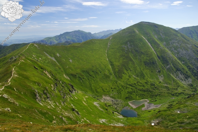 In den letzten Reiseberichten habe ich die Naturstandorte von Sempervivum montanum ssp. carpathicum vorgestellt, in diesem Reisebericht stellt ich einen Naturstandort von Jovibarba hirta var. preissiana. Warum habe ich bis jetzt nicht über Jovibarba hirta var. preissiana nicht geschrieben? Die Antwort finde ich einfach – Gestein. Jovibarba hirta var. preissiana wächst häufiger auf Kalkstein oder Dolomit. Da bilden die Pflanzen ziemlich große Kolonien, es ist möglich eine große Anzahl der Rosetten an solchen Naturstandorten zu beobachten, die Naturstandorte sind ziemlich groß (betrifft die Fläche). Man kann diese Naturstandorte leicht finden. In den alpinen Lagen wächst Jovibarba hirta var. preissiana auch auf Granit, diese Naturstandorte sind sehr klein. In meisten Fällen handelt es um eine Gruppe der Rosetten, diese Gruppe der Rosetten wächst oft an den Steinen und zwischen den Steinen versteckt im Gras oder in den Bewuchsen der Heidelbeerensträucher. Solche Naturstandorte sind eher selten und es ist wirklich schwierig diese Naturstandorte zu finden. Wenn die Rosetten nicht blühen, ist die Suche der Pflanzen noch schwieriger.
