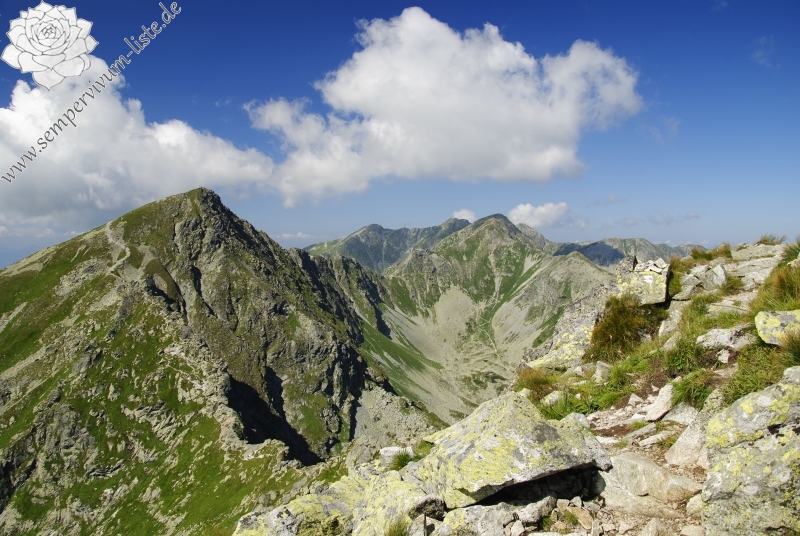Der Berg Ostrý Roháč liegt auch in dieser Gruppe mit dem Namen Roháče. Der Berg gehört nicht zu den höchsten Bergen, trotzdem ist dieser Berg sehr bekannt. Der Berg ist steil, spitzig und felsig, das Wort „ostrý“ ist es möglich als „scharf“ oder „spitzig“ auf Deutsch zu übersetzen. Der Berg Ostrý Roháč wird oft besucht, über dem Berg führt nämlich einen rot markierten touristischen Weg, viele Teile dieses Weges werden durch Ketten gesichert. Die südwestlichen Abhänge des Berges sind felsig aber nicht so steil, da habe ich einen Naturstandort von Sempervivum montanum ssp. carpathicum gefunden.