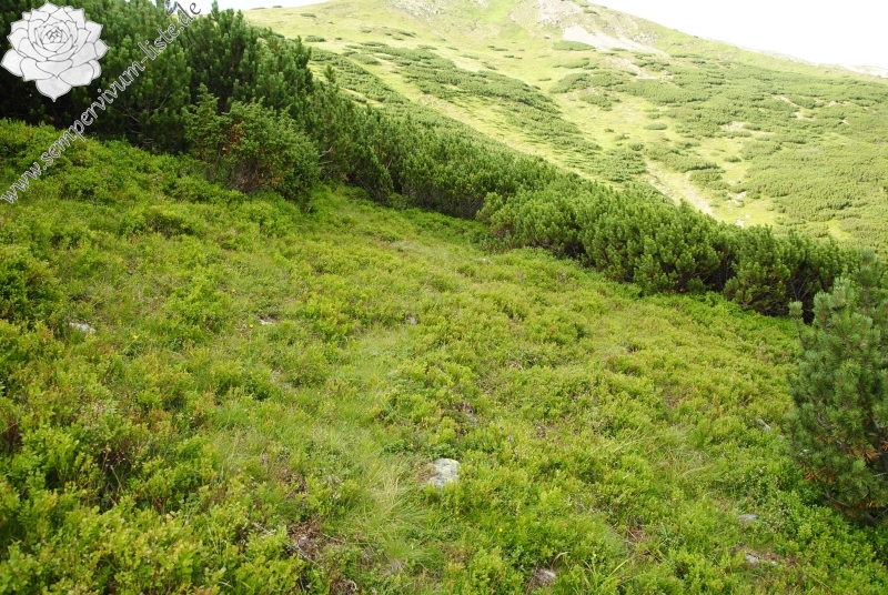 Jetzt noch etwas zu dem Naturstandort. Der Naturstandort liegt schon niedrig, die Abhängen der Berge werden da durch Bergkiefer bewachsen, trotzdem gibt es in diesen Meereshöhen viele Naturstandorte von Sempervivum montanum ssp. carpathicum. Die Pflanzen wachsen oft an den Steinen und in der Nähe der Steine – die Steine befinden sich oft gleich unter den „Bäumen“ von Bergkiefer, an den Orten ohne Bewächsen von Bergkiefer und auch in den Bewächsen von Blaubeerensträuchern. In diesem Fall sind die Rosetten von Sempervivum montanum ssp. carpathicum an einem Ort ohne Bewächsen von Bergkiefer gewachsen, sie sind aber unter den Sträuchern von Blaubeeren und teilweise im Gras gewachsen. Die Naturstandorte von Sempervivum montanum ssp. carpathicum sehen in den niedrigeren Lagen ein bisschen andres als oben.