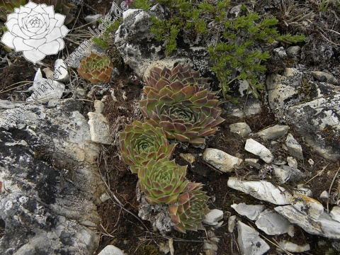 Die Steine, sogar die Lücken unter den Steinen, ist das echt für Jovibarba heuffelii var. glabra. Dort wachsen viele Rosetten, viele von diesen Rosetten waren für das Blühen vorbereitet. Aber in der Zeit meines Besuches haben sie nicht geblüht, es war für diese Pflanzen zu früh (Anfang Julis).