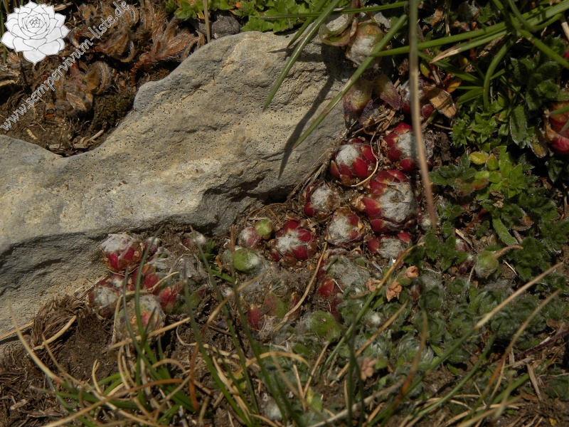 Die Rosetten waren klein, nur bis 1,5 cm im Durchmesser. Die Rosetten waren geschlossen. Ich glaube, dass sie geschlossen dank des Mangels an Wasser waren. Die Rosetten war schön rot gefärbt und das Spinngewebe war dicht. Viele Rosetten haben die neuen Ausläufer gebildet. Ich habe auch am Standort ein paar blühenden Rosetten gesehen. Die Blüten habe ich auch in meinem Garten beobachtet. Die Blüten sind rosa gefärbt und sie entsprechen der Art Sempervivum arachnoideum.