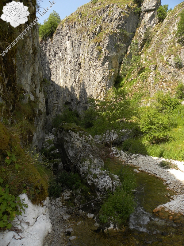 Wo liegt den Standort? Die Rosetten von Jovibarba heuffelii var. glabra habe ich in der Nähe der Brücke, an den Felsen am Anfang der Schlucht und auch im Tal über dem Anfang der Schlucht gefunden. Die Rosetten in der Nähe der Brücke habe ich auch fotografiert. Die Rosetten, die an den Felsen im Schatten gewachsen sind, habe ich dank des wenig Lichtes nicht fotografiert.