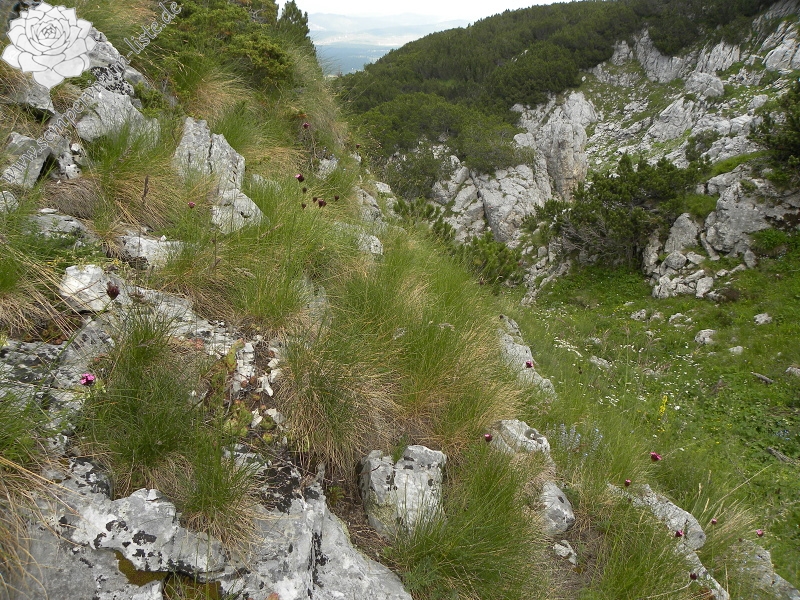 Es gibt mehrere Standorte von Sempervivum marmoreum an dem Berg Crvena greda. Der Standort, der ich in diesem Reisebericht zeigen möchte, liegt an dem östlichen Abhang des Berges Crvena Greda. Es liegt in dem Bewuchs der Kiefer.