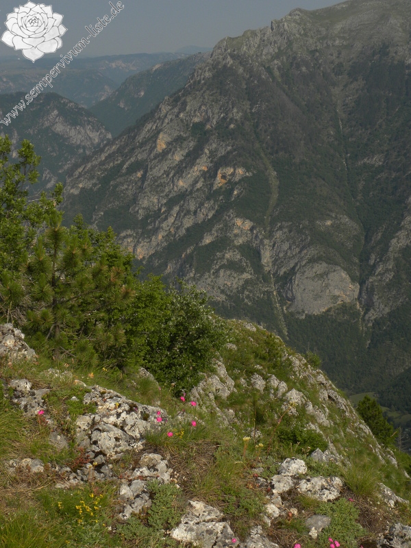Es wächst (nicht nur) Sempervivum marmoreum var. marmoreum da. In diesem Beitrag möchte ich einen Standort in der Nähe des Gipfels zeigen. Der Standort liegt in der Höhe um 1615 Meter, das Gestein wird Kalkstein gebildet.