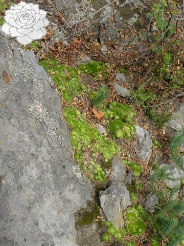 Wenn wir auf den Rändern der Felsen suchen, finden wir bald Jovibarba globifera subsp. globifera. Zuerst finden wir ein paar kleinen Kolonien, dann finden wir im mehr und mehr Rosetten. Jovibarba globifera bildet hier wirklich große Kolonien.