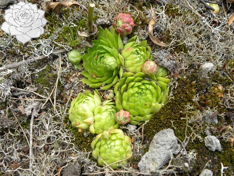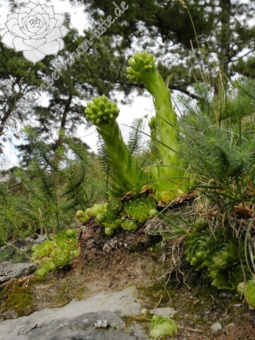 Der Grund des Blühens weiß ich nicht. Ich kann nur spekulieren. Vielleicht die Bedingungen, vielleicht das Gestein, vielleicht die Größe der Rosetten, oder die Eigenschaften von Jovibarba globifera subsp. globifera. Vielleicht ist Jovibarba globifera subsp. globifera "faul" zu blühen - sie blüht allgemein selten (im Gegenteil zu Jovibarba hirta und so weiter...).