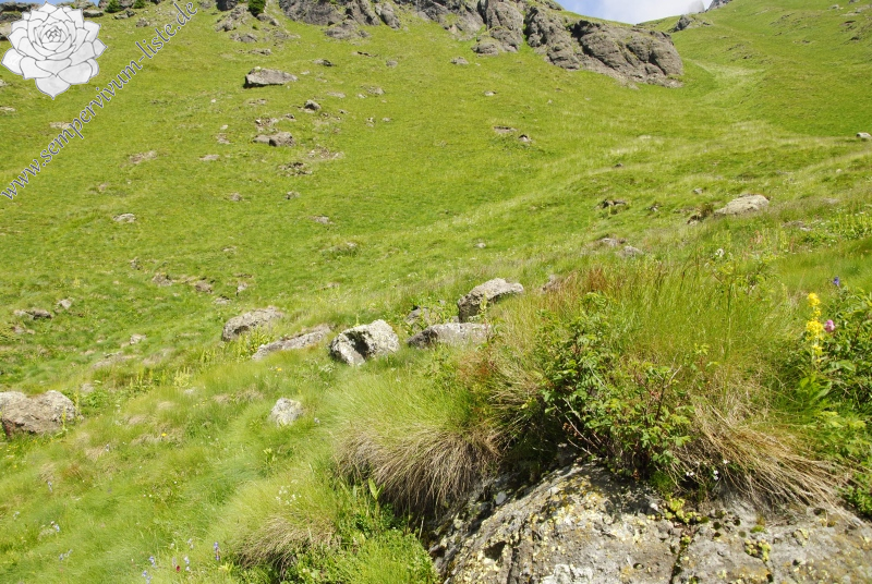 In dem Sattel Passo die Fedaia fängt einen touristischen Weg an, dieser Weg steigt zu der Hütte Rifugio Padon auf. Etwa in der Mitte des Weges zu der Hütte gibt es eine kleine Wiese mit den großen Steinen, in der Landkarte habe ich den Namen Cian de Stanzón für diesen Ort gefunden. Die Steine habe ich untersucht und habe Hauswurz gefunden. An diesem Naturstandort habe ich unterschiedliche Hauswurz gefunden, nicht nur die botanischen Arten, sondern auch die Hybride.