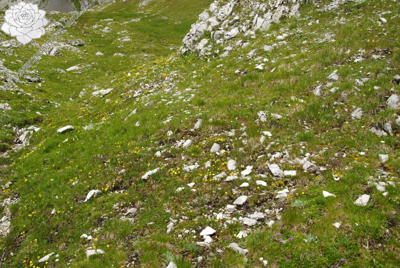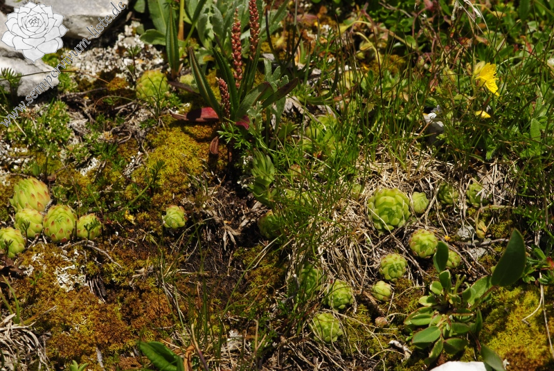 Es geht um einen kleinen Felsen in den Wiesen, unter diesen Felsen gibt es kleine Steine und das Gras wächst spärlich zwischen diesen Steinen, so sieht der Naturstandort von Sempervivum dolomiticum aus. Die Rosetten von Sempervivum dolomiticum wachsen in den unteren Teil des Felsens und auch zwischen den kleinen Steinen unter den Felsen. Überraschend geht es um einen großen Naturstandort von Sempervivum dolomiticum, eine riesengroße Menge der Rosetten aller Größen wächst an diesem Naturstandort. Die Rosetten sind meistens in den kleinen Gruppen gewachsen, selbstverständlich habe ich auch einzeln wachsende Rosetten am Naturstandort beobachtet. Die Rosetten sind vor allem in der Nähe der Steine, teilweise an dem Fuß des kleinen Felsens und auch im Moos in dem spärlichen Gras unter dem Felsen gewachsen.