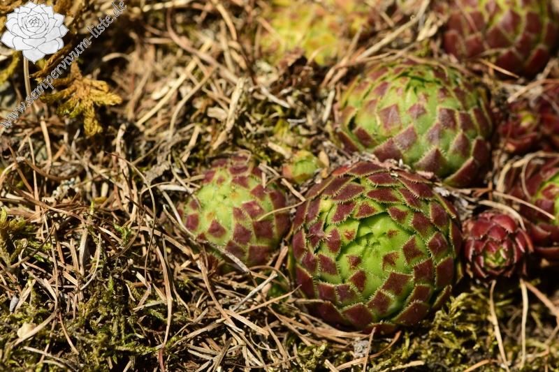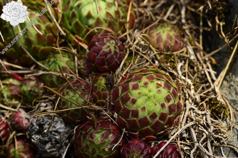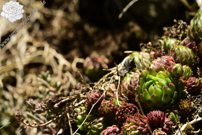 Die Rosetten waren in der Zeit meines Besuches vor allem geschlossen, es war lange trocken und es war auch die ersten Hälfte Frühlings. Darum waren die äußere Rosettenblätter dunkel rot, rot oder lilarot gefärbt, die Rosetten in dem Schatten von Kiefer hatten äußere Rosettenblätter nur in dem oberen Drittel so gefärbt. Obwohl die Rosetten geschlossen waren, sind die Rosetten gewachsen und einige Rosetten haben neue Ausläufer gebildet. Am Naturstandort habe ich keinen vertrockneten Blütenstengel gefunden. Es muss auch erwähnt werden, dass einige Rosetten durch Endophyllum sempervivi befallen wurden.