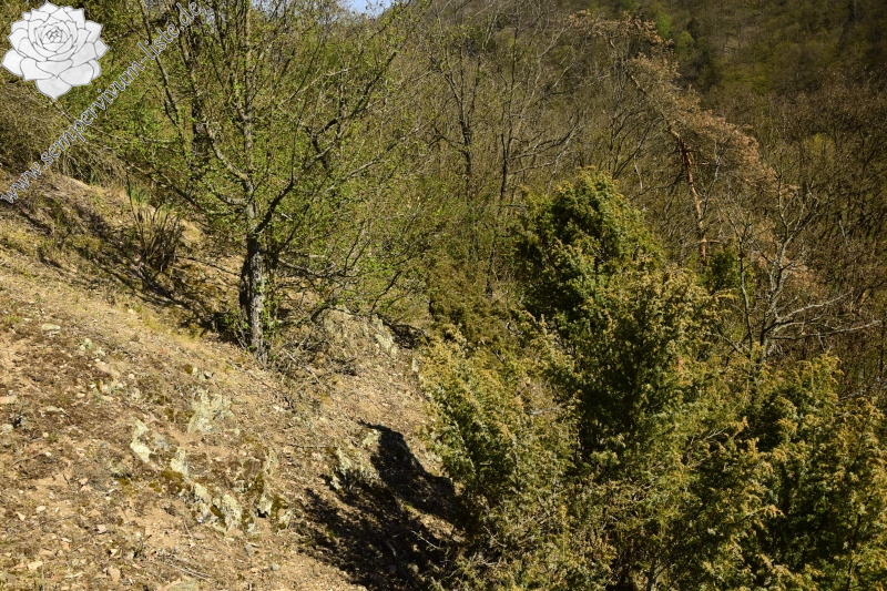 Nicht weit von der Brücke, nur etwa 250 Meter, emporragen über der Straße an den Abhängen über dem linken Ufer des Flußes kleine Felsen. Diese Felsen werden teilweise in dem Wald versteckt, sind durch die Bäume in der Umgebung teilweise beschattet, ein paar Sträucher wächst direkt an diesen Felsen. Diese Felsen sind wirklich kleinräumig und nur etwa 15 Meter hoch, trotzdem habe ich gerade da Jovibarba globifera an einem Naturstandort beobachtet.